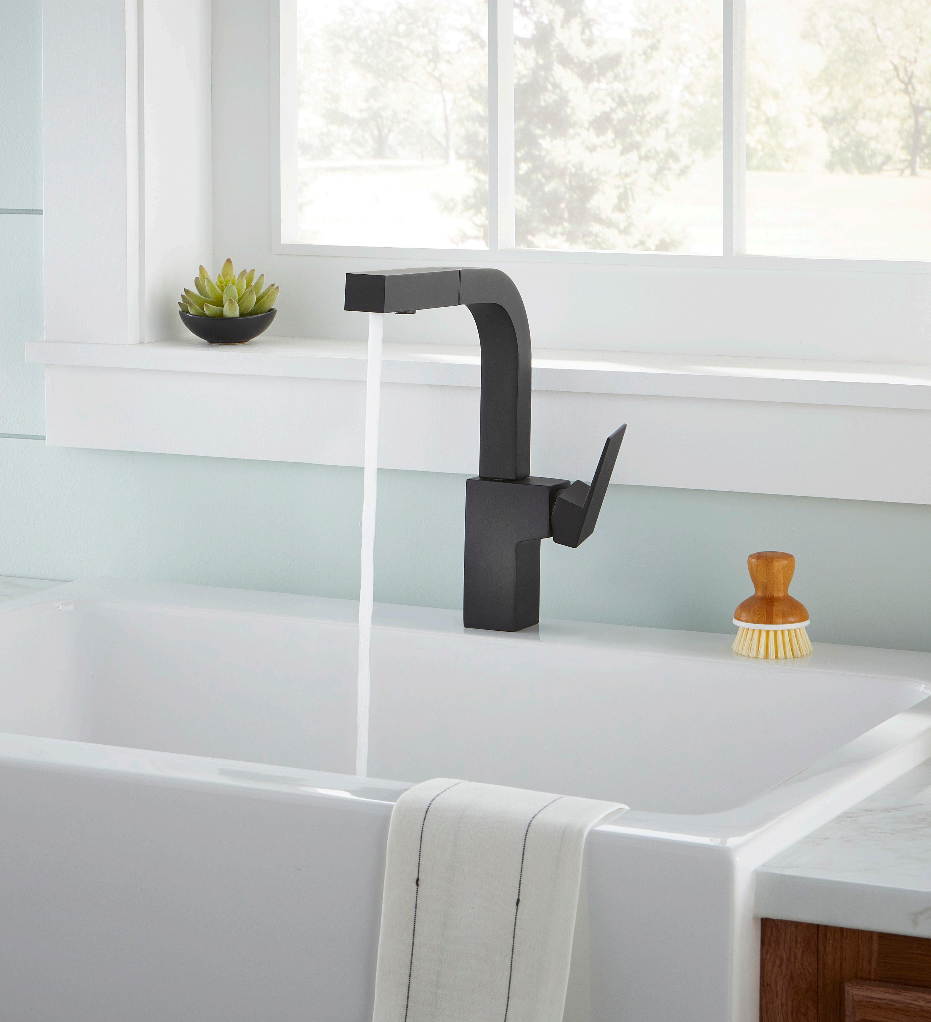 Le style audacieux du robinet de cuisine Mid-TownMD à bec rétractable présente des angles définis ainsi qu’un aspect contemporain et minimaliste. Son aspect structuré, caractérisé par un corps lisse et une poignée élancée au style moderne, lui confère une personnalité architecturale.