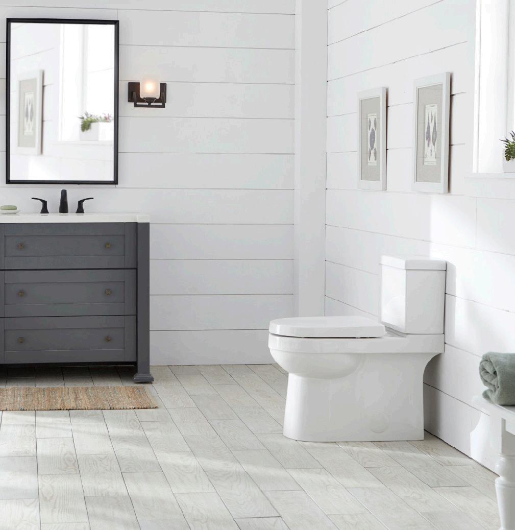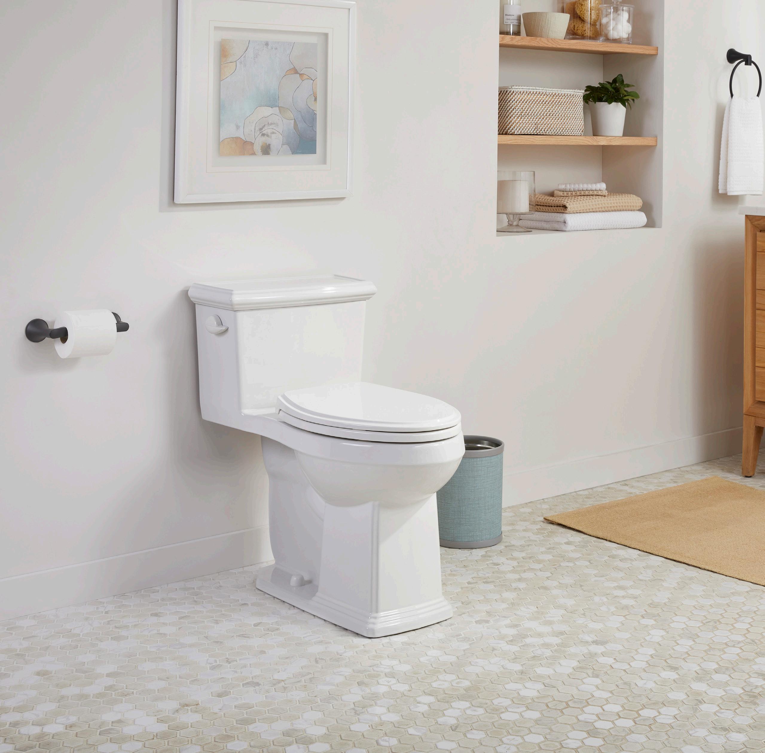 Page de gauche : Toilette monopièce Logan SquareMC à cuvette allongée ErgoHeightMC, plomberie brute de 12 po, 1,28 gpc/Blanc/G0021020