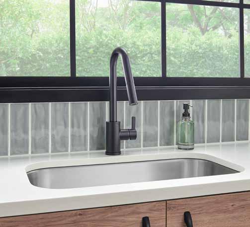 Page de gauche, côté droit : Robinet de cuisine VaughnMD à une seule poignée à bec extensible/Noir satiné/D454419BS