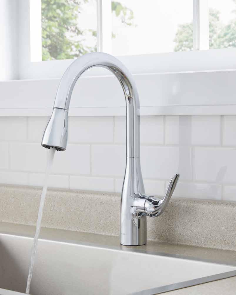 Page de gauche : Robinet de cuisine DraperMD à une seule poignée à bec extensible/Acier inoxydable/D454028SS
