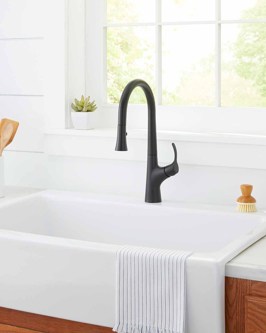 Page de gauche : Robinet de cuisine Mid‑TownMD à une seule poignée à bec rétractable/Noir satiné/D404562BS