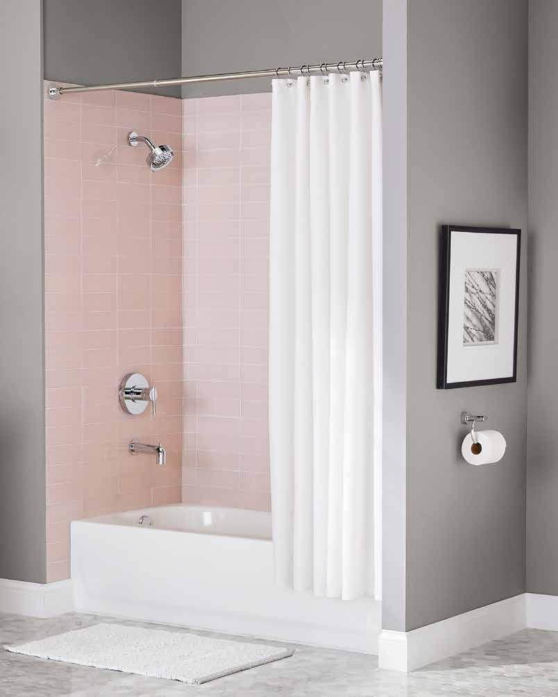 Page de gauche : Ensemble de garnitures SiriusMD pour baignoire et douche, 1,75 gal/min*/Chrome/D511044TC Ensemble de garnitures SiriusMD pour inverseur ou soupape régulatrice de débit*/Chrome/D560944T Trousse d’assemblage de barre coulissante carrée de 30 po VersaMC avec douche à main rectangulaire à une seule fonction, 1,75 gal/min/Chrome/D462726 Coude d’alimentation carré/Chrome/D469059