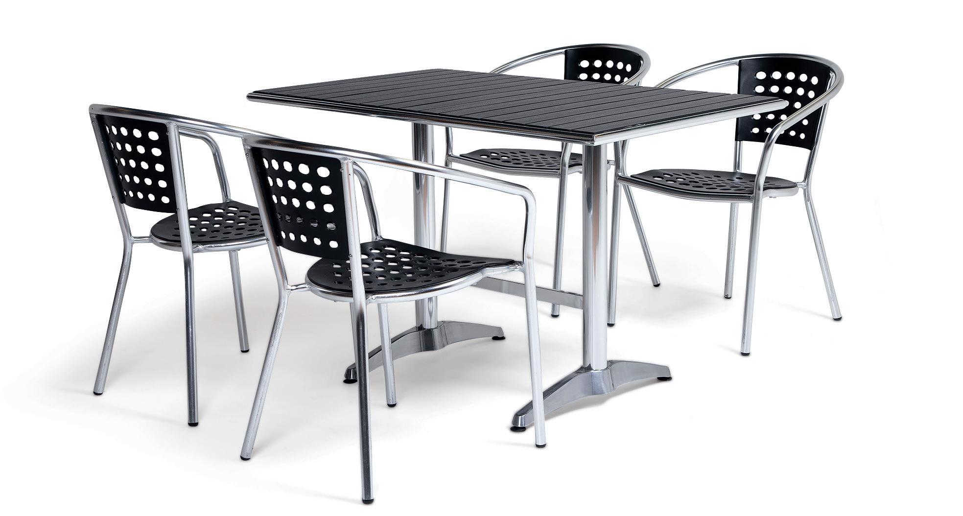 Vedligeholdelsesfrit bord med plade og stel i lækker sort aluminium, som kan tåle det meste og passer til vores nordiske klima. Højde 720 mm. BxD 1200x700 mm. Sort.