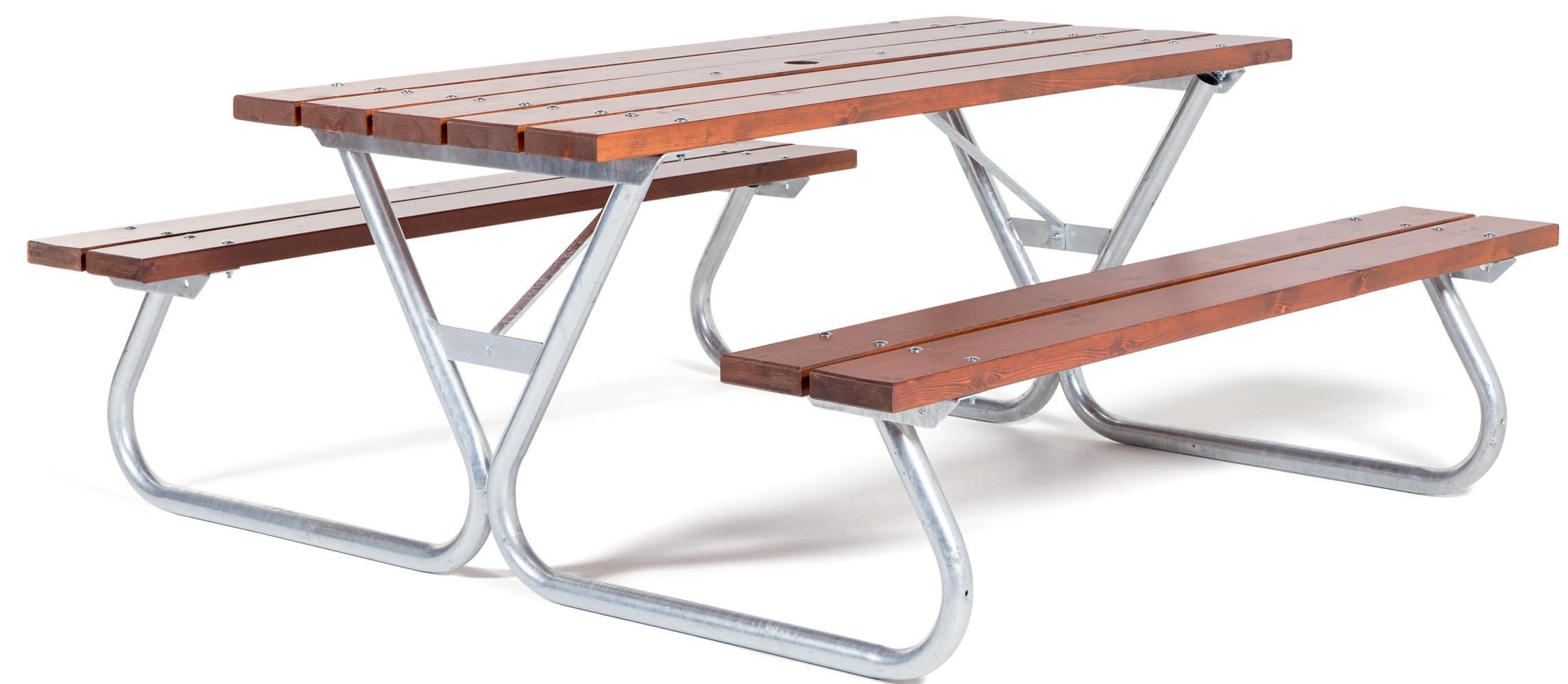 Rummeligt og robust bord med faste bænke. Galvaniseret stel i stål med trædetaljer i brunlaseret fyrretræ.