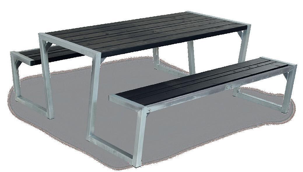 Stilrent bord med faste bænke i trykimprægneret sortmalet træ. Varmgalvaniseret stel. Leveres usamlet. Køb ryglæn og læn dig tilbage. L 1760, B 1900, H 730 mm.