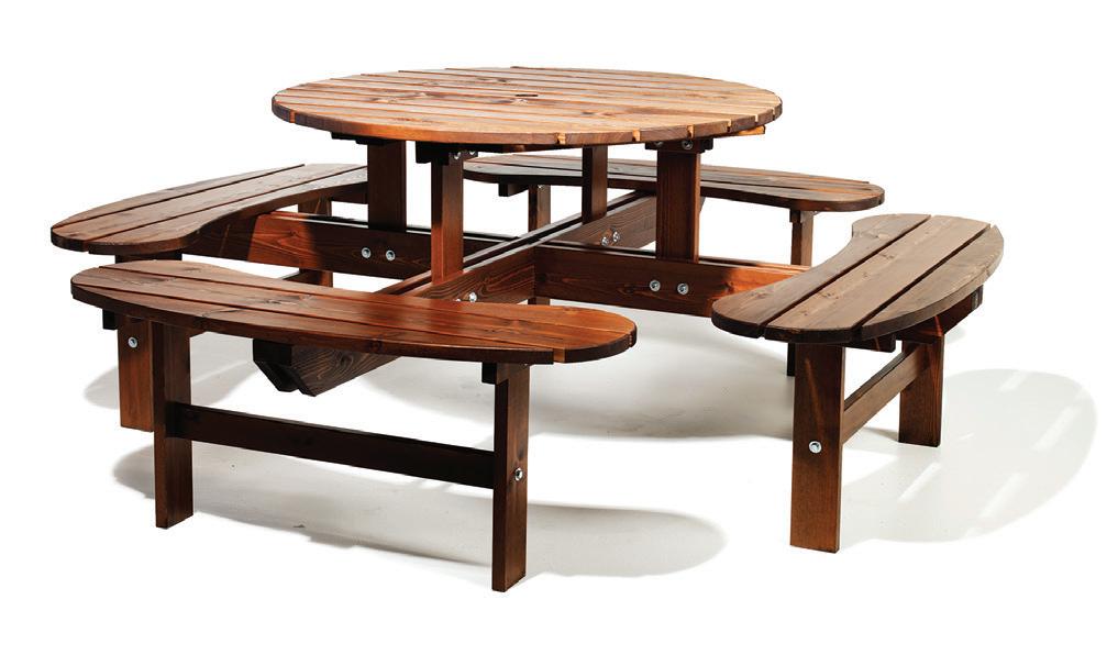Praktisk og stabilt udendørsmøbel med 8 siddepladser i massiv brunlaseret fyr. Tykkelse 32 mm. Hul til parasol Ø 50 mm i bordplade. Bord Ø1000 mm, højde 770 mm. Siddehøjde 480 mm. Totalstørrelse Ø 2000 mm. Leveres umonteret.
