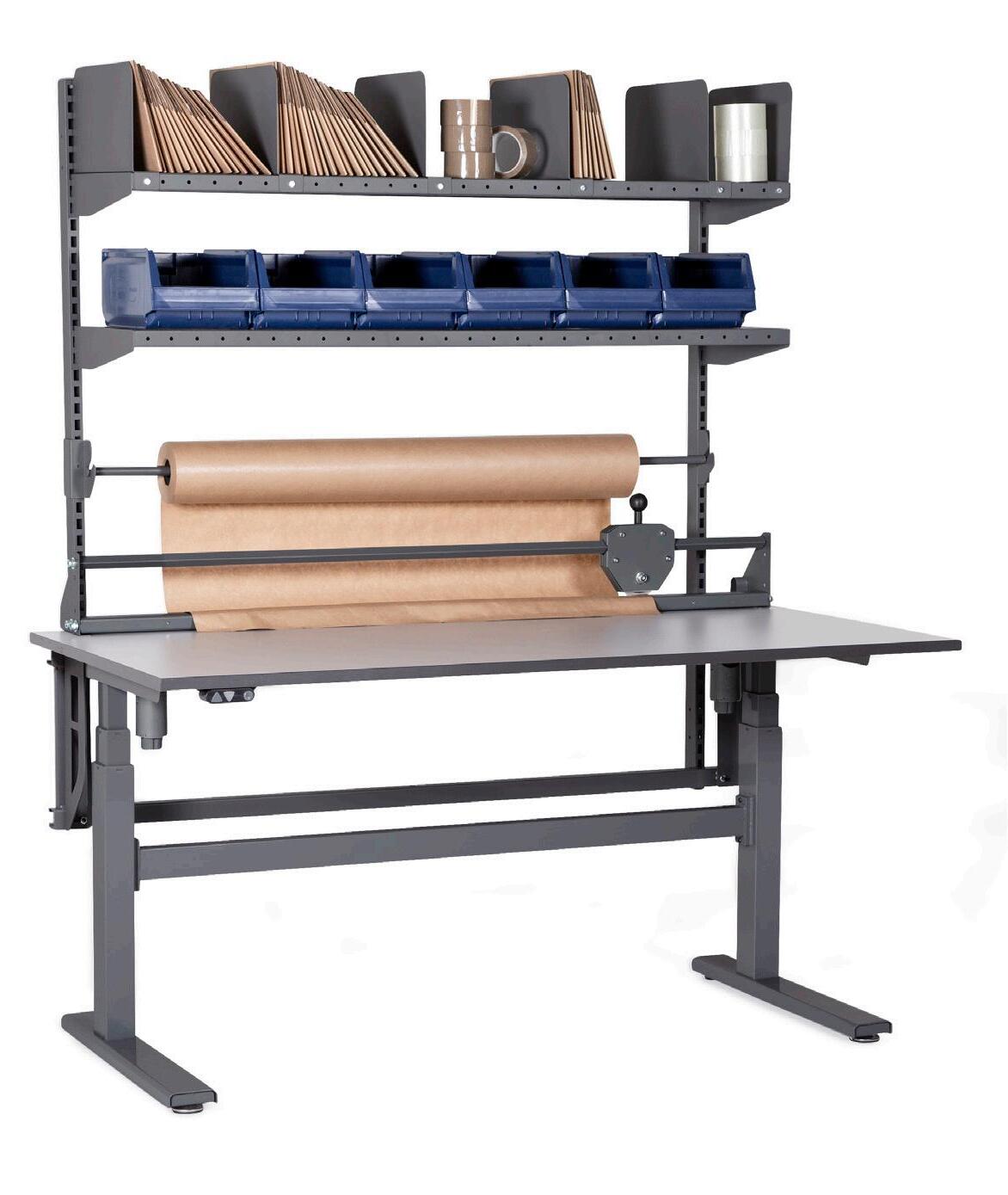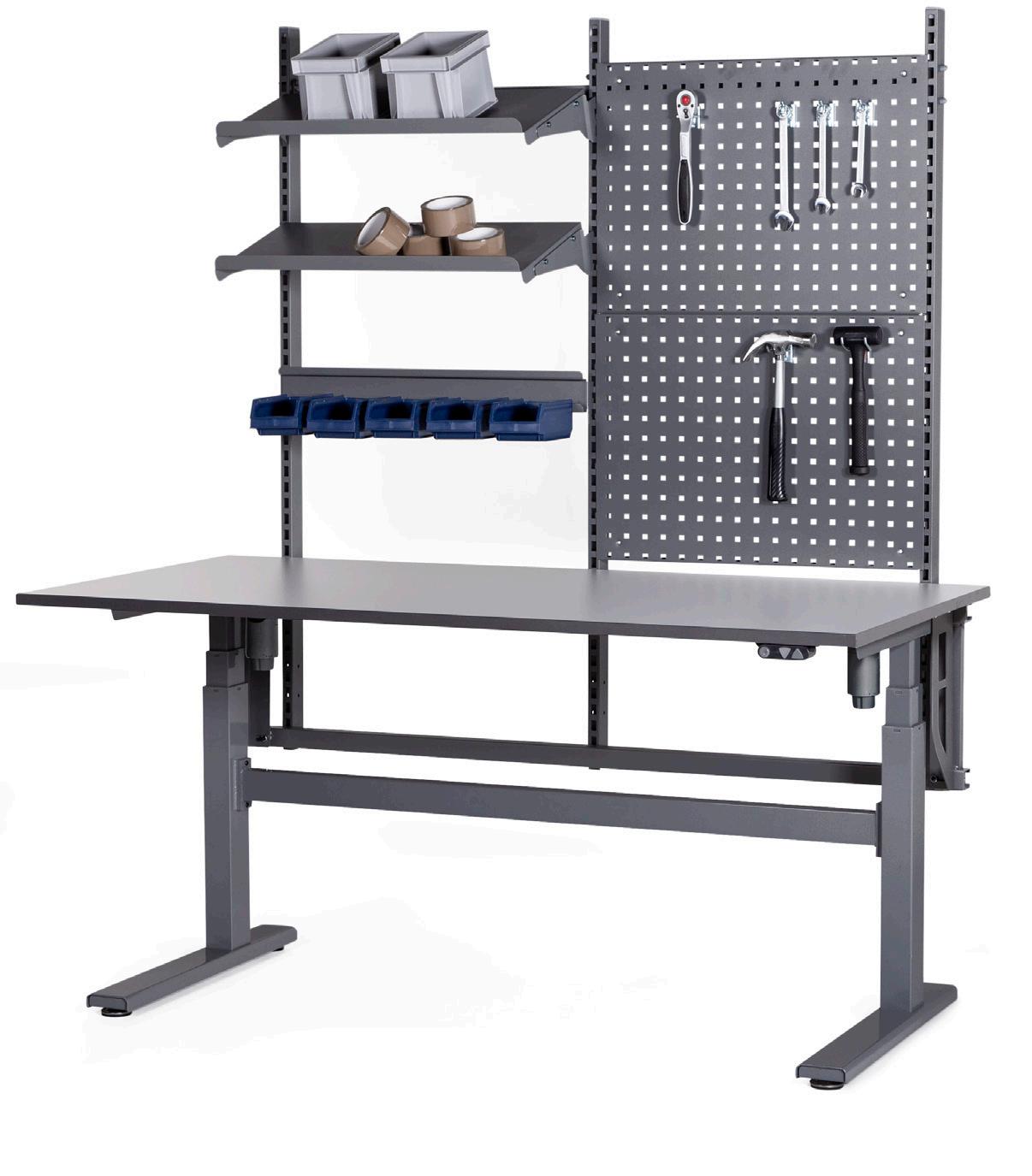 Hele arbejdspladsen i en samlet pakke. Højdejusterbar elektrisk betjent arbejdsbord, bordplade i højtrykslaminat, tilbygningsramme med tre søjler, stabiliseringsstang og to vinklede hylder, to værktøjstavler og en kasseskinne. 1600x800 mm Alt hvad du har brug for!