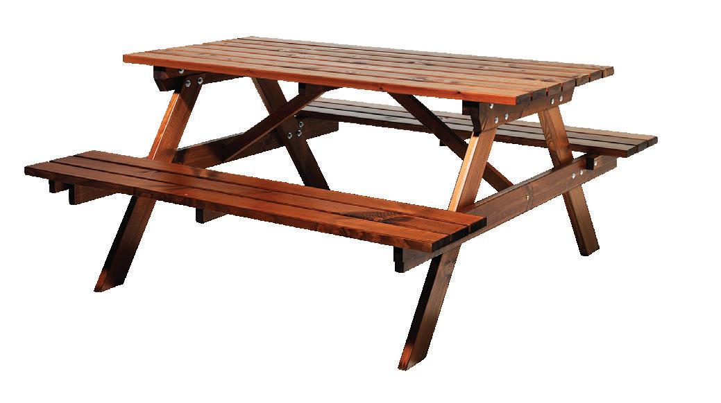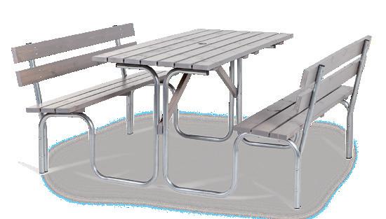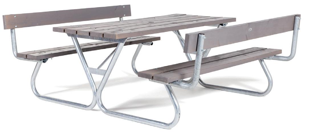Rummeligt og robust bord med faste bænke. Galvaniseret stel i stål med trædetaljer i brunlaseret fyrretræ.
