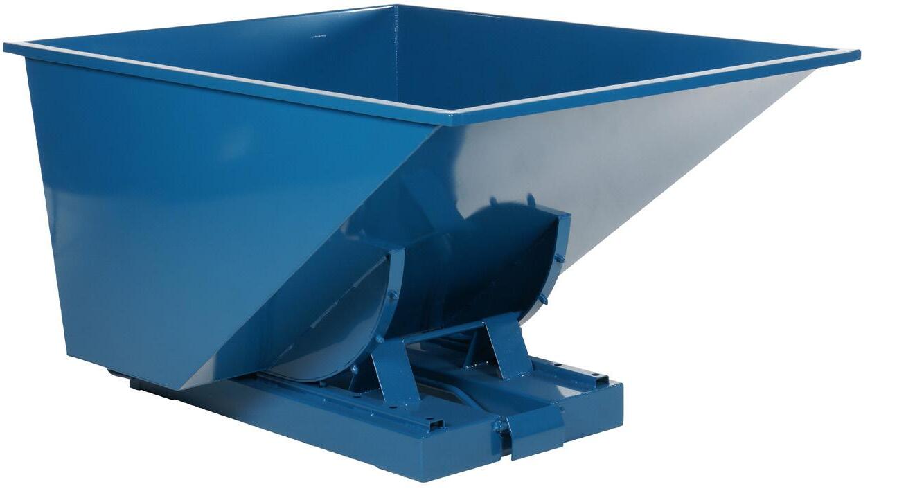 Selvtømmende tipcontainer til kildesortering, affalds- og materialehåndtering. Automatisk tipning, tilbagerulning og låsning. Tømning via fjederbelastet trykplade eller manuelt med håndtag.
