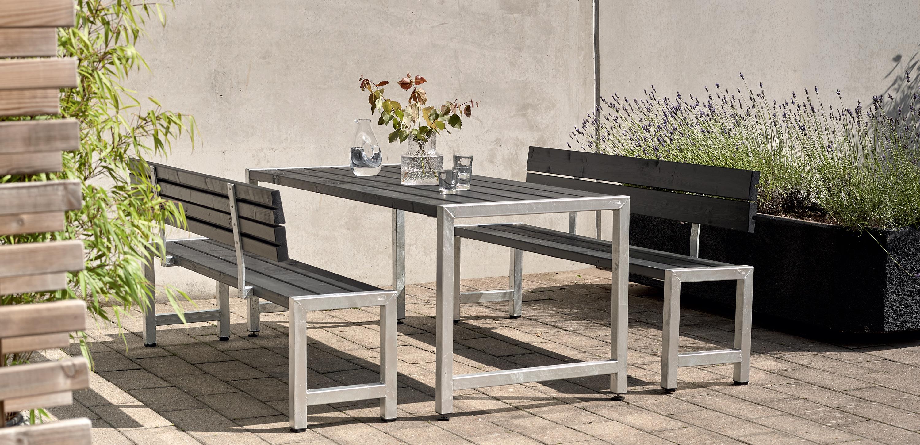 Stilrent bord med faste bænke i trykimprægneret sortmalet træ. Varmgalvaniseret stel. Leveres usamlet. Køb ryglæn og læn dig tilbage. L 1760, B 1900, H 730 mm.