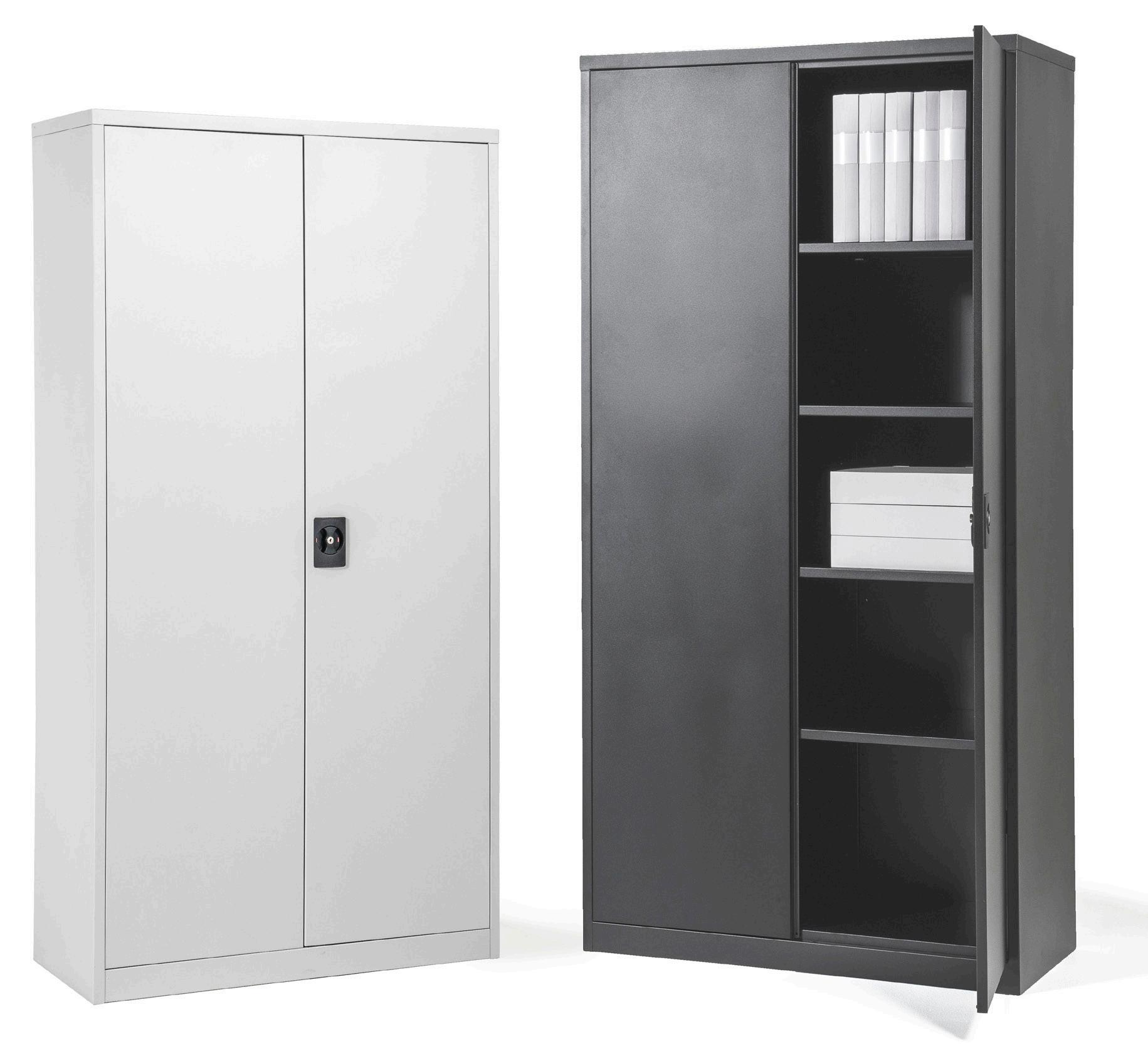 Prisbilligt opbevaringsskab til kontor, lager eller værksted. Pulverlakeret og ridsefast finish. Dørene har lyddæmpende beslag. Kan klare 45 kg fordelt jævnt pr.hylde. Leveres med fire flytbare hylder og espagnoletlås med to nøgler. Fås i grå og sort.