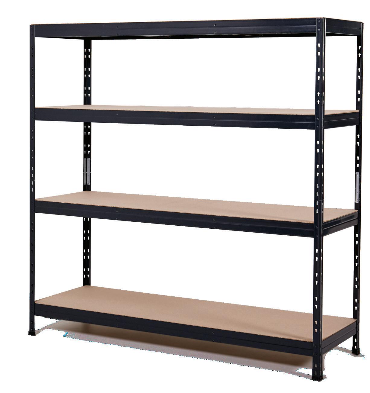 Vankka teräshylly siirrettävillä, puukuidusta valmistetuilla hyllytasoilla vahvistuspalkilla. Helppo asentaa täysin ilman ruuveja, mahdollista asentaa useina yhdistelminä.
