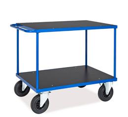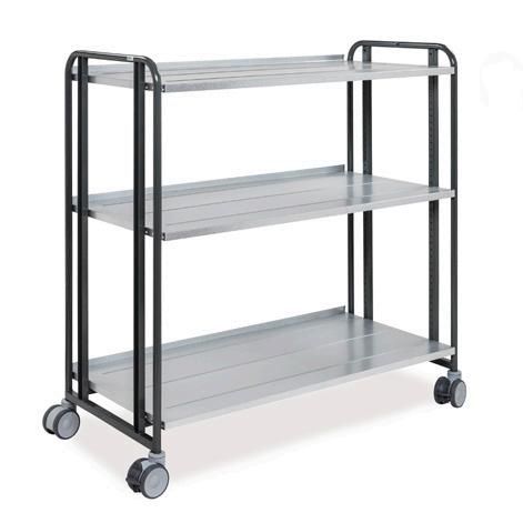 Ergonomiset vaunut vahvoilla harmailla jauhemaalatuilla teräsrungoilla ja laminaattilevyillä. Kahvassa on ergonominen muotoilu. Helposti pyörivät Non-mark pyörät (eivät jätä jälkiä). 2 kiinteää pyörää ja 2 kääntyvää pyörää jarrulla, Ø 200 mm.