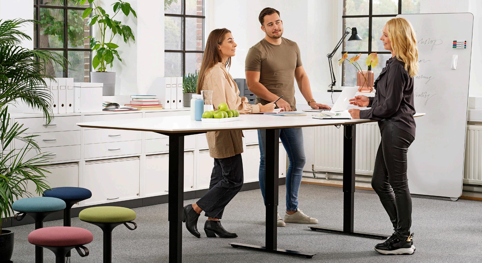 Stående klapsalver til et elektrisk justerbart bord, dvs. mødelokalet? Trendige Trend fås med stålfod i krom, sort eller hvid og bordplade i slidstærk hvid laminat. Klarer 150 kg fordelt.