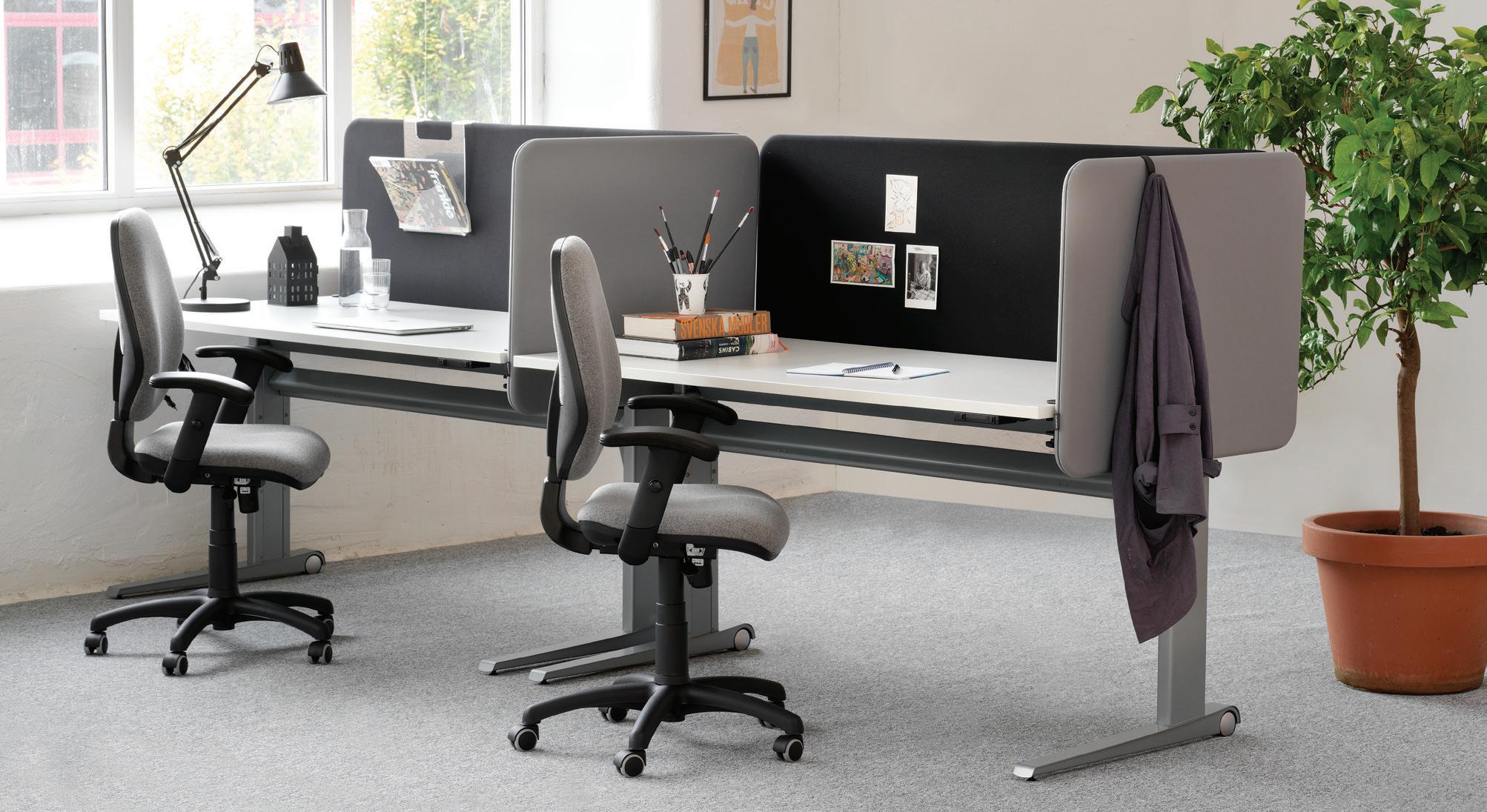 Gulvskærm standard serien består af et begrænset og optimeret udvalg af de mest solgte af gulvskærmene. For at gøre det nemmere for dig som kunde, medfølger altid det antal ben som du behøver for at kunne anvende gulvskærmen såvel fritstående som koblet sammen med andre i forlængelse af hinanden. Det tyndere look efterlader et pænere og lettere indtryk, uden man dog af den grund mister den afskærmende effekt. Skærmen absorberer ligeledes lyden fint og hjælper med til at skabe et perfekt lydlandskab. Skærmen findes i to modeller, med afrundede eller med lige sider og hjørner, så den passer optimalt til netop din indretningsstil på kontoret. Skærmen består af en lydabsorberende fyldning, som er monteret inden i en massiv træramme. Benene er sorte og øger skærmhøjden med 50 mm. Koblingsbeslag gør det muligt at sammenkoble flere gulvskærme efter hinanden eller i en vinkel. Findes i to farver, sort og grå.