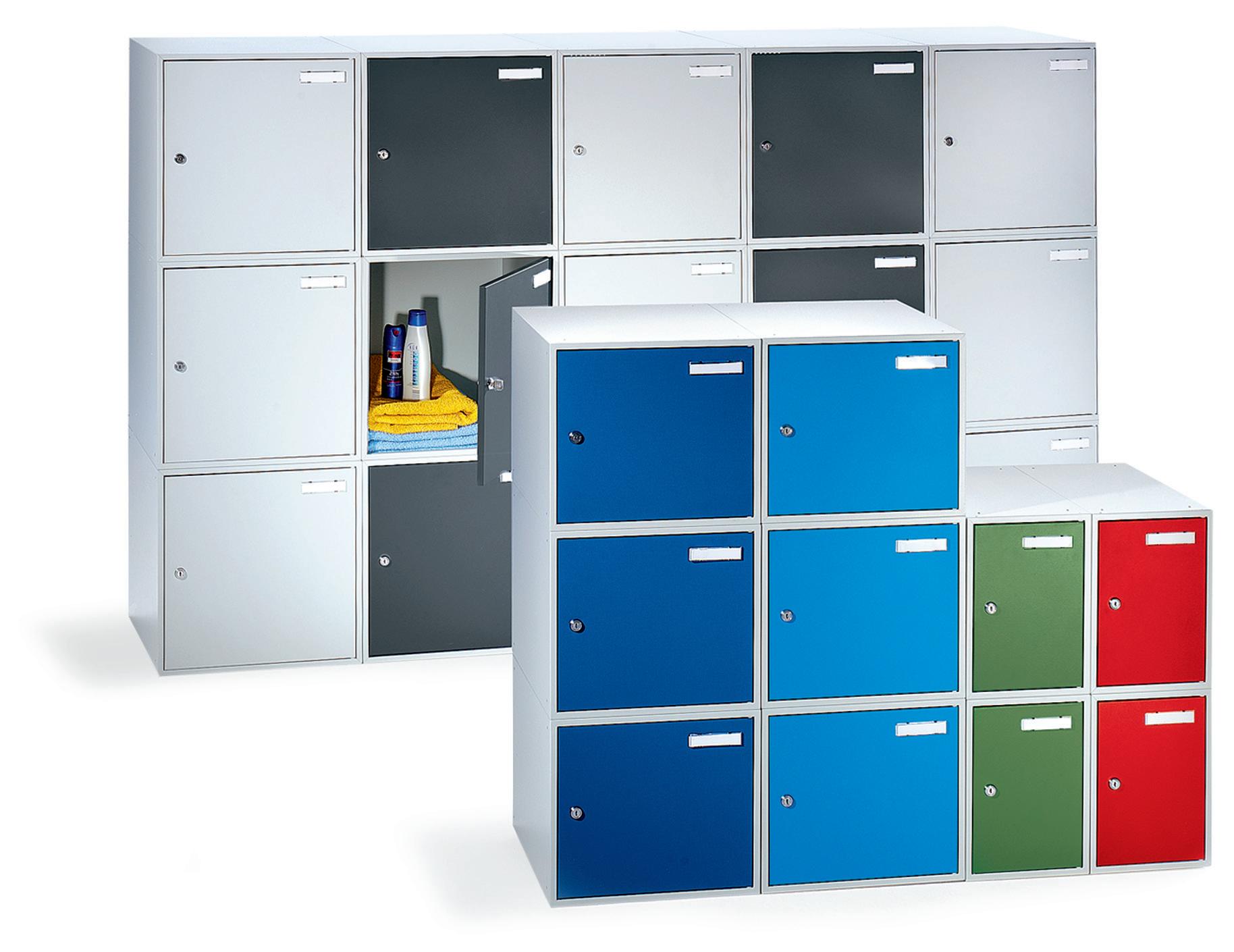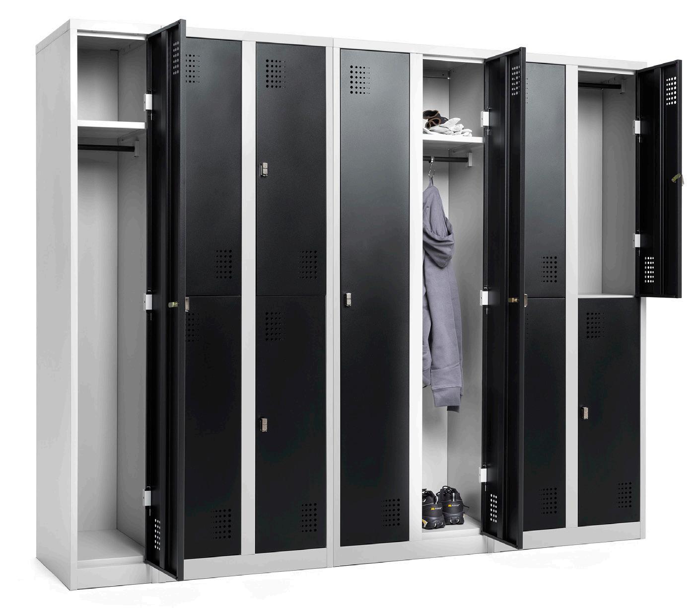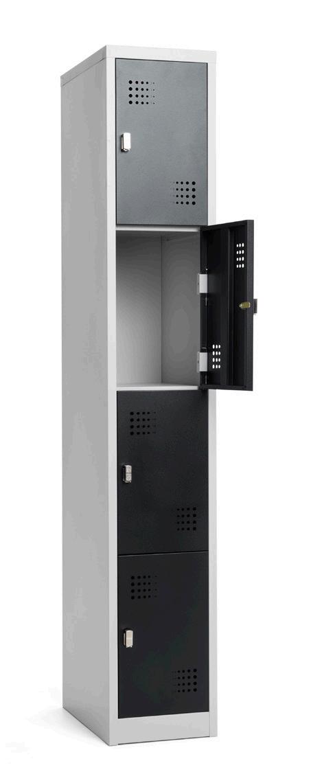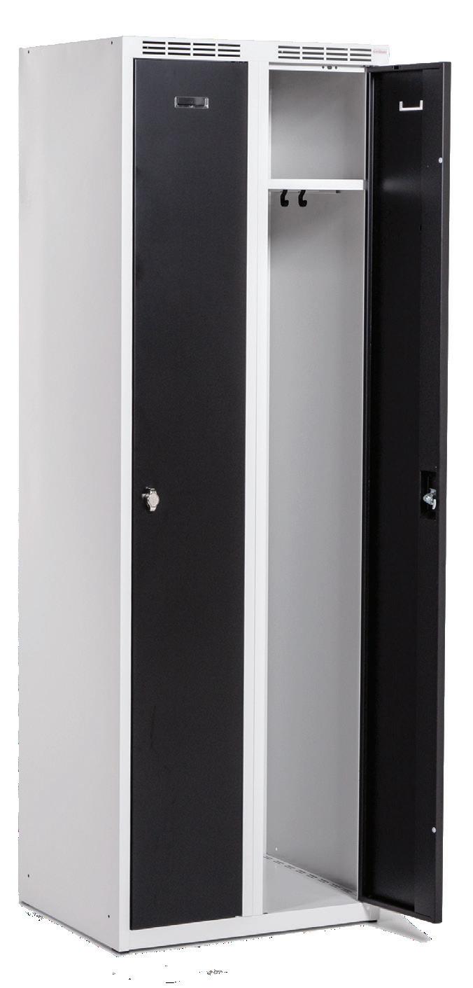Fräscha skåp för kläder och förvaring i skolor och andra miljöer. Stabil konstruktion med integrerad sockel som kan placeras direkt på golvet. Reptålig pulverlackerad stomme i ljusgrått eller svart med hög finish. Finns i flera utföranden. Klädskåp med hel dörr levereras med hatthylla, klädstång och krok. Antal skåp Yttermått Stomme/dörr