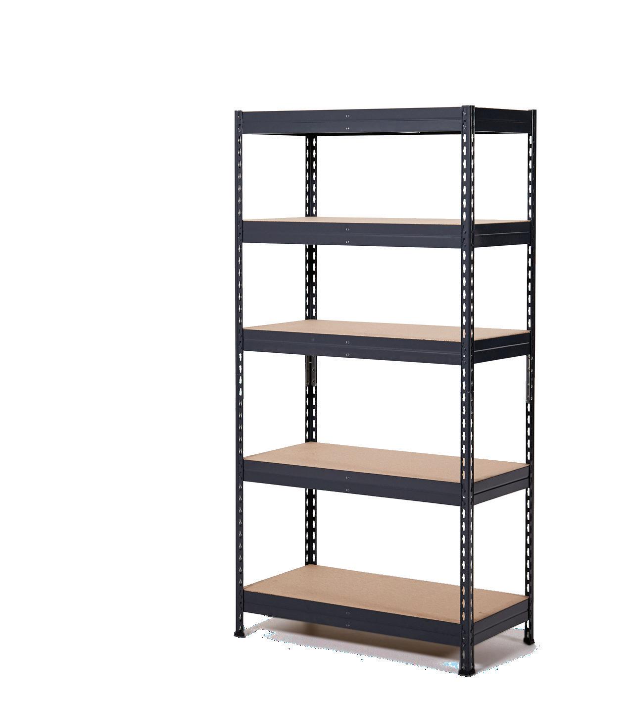Stabil stålhylla med hyllplan av träfiber. Enkel att montera helt utan skruvar. Grålackerad (RAL 7016) i Epoxylack. Hyllan är försedd med förstärkningsbalk under hyllplanen. Hyllan kan monteras antingen i två halvsektioner på höjden eller som en helsektion. Det går även att kombinera ihop hel och halvsektioner med fixeringsbeslag. Hyllplanen är flyttbara.