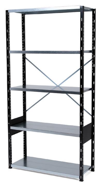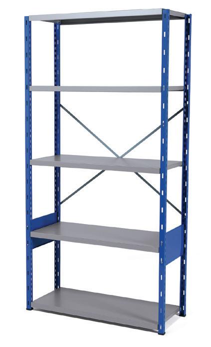 Stabil stålhylla med galvade hyllplan. Enkel att montera helt utan skruvar. Passar lika bra som arkivhylla som lagerhylla. Pulverlackerade stolpar och stag i antingen blå (RAL 5010) eller grå (RAL 7016) med galvade hyllplan. Hyllan kan byggas som enkelsektion eller flera sektioner med hjälp av fixeringsplatta. Hyllplanen är flyttbara var 38:e mm. Hyllan levereras komplett med hyllplan och golvskoning. Hyllan bör förankras i golv eller vägg.