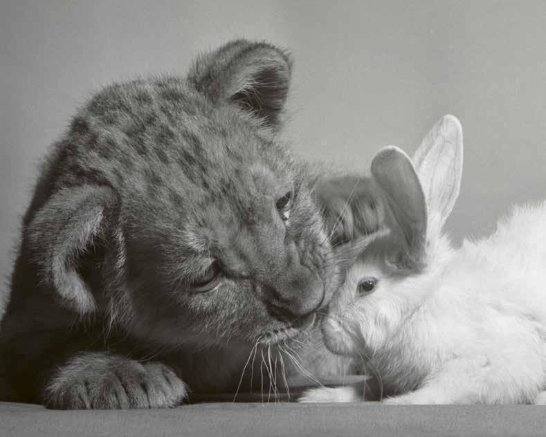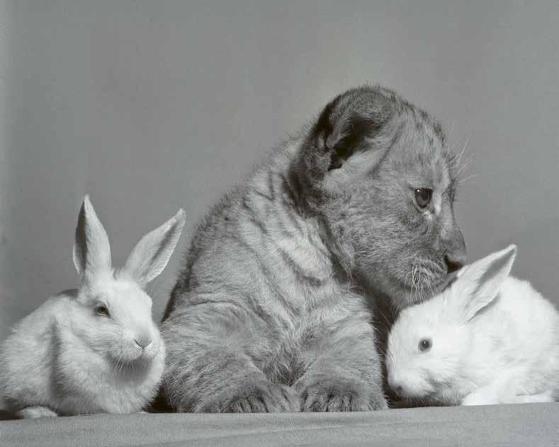 Ed ecco il piccolo leone con i conigli bianchi.
