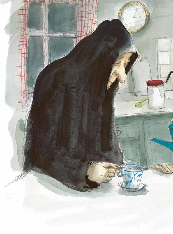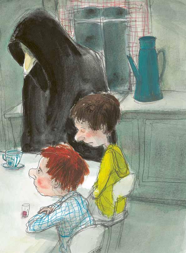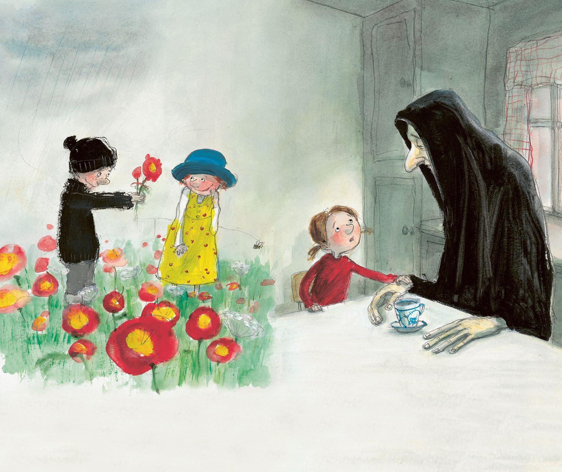 Il tempo passava, ma alla fine la Morte posò la mano ossuta sulla tazza per indicare che il caffè le bastava e fece per alzarsi. All’improvviso però la bimba più piccola, che fino ad allora l’aveva guardata in silenzio, l’afferrò per una manica e disse con la sua voce più struggente: