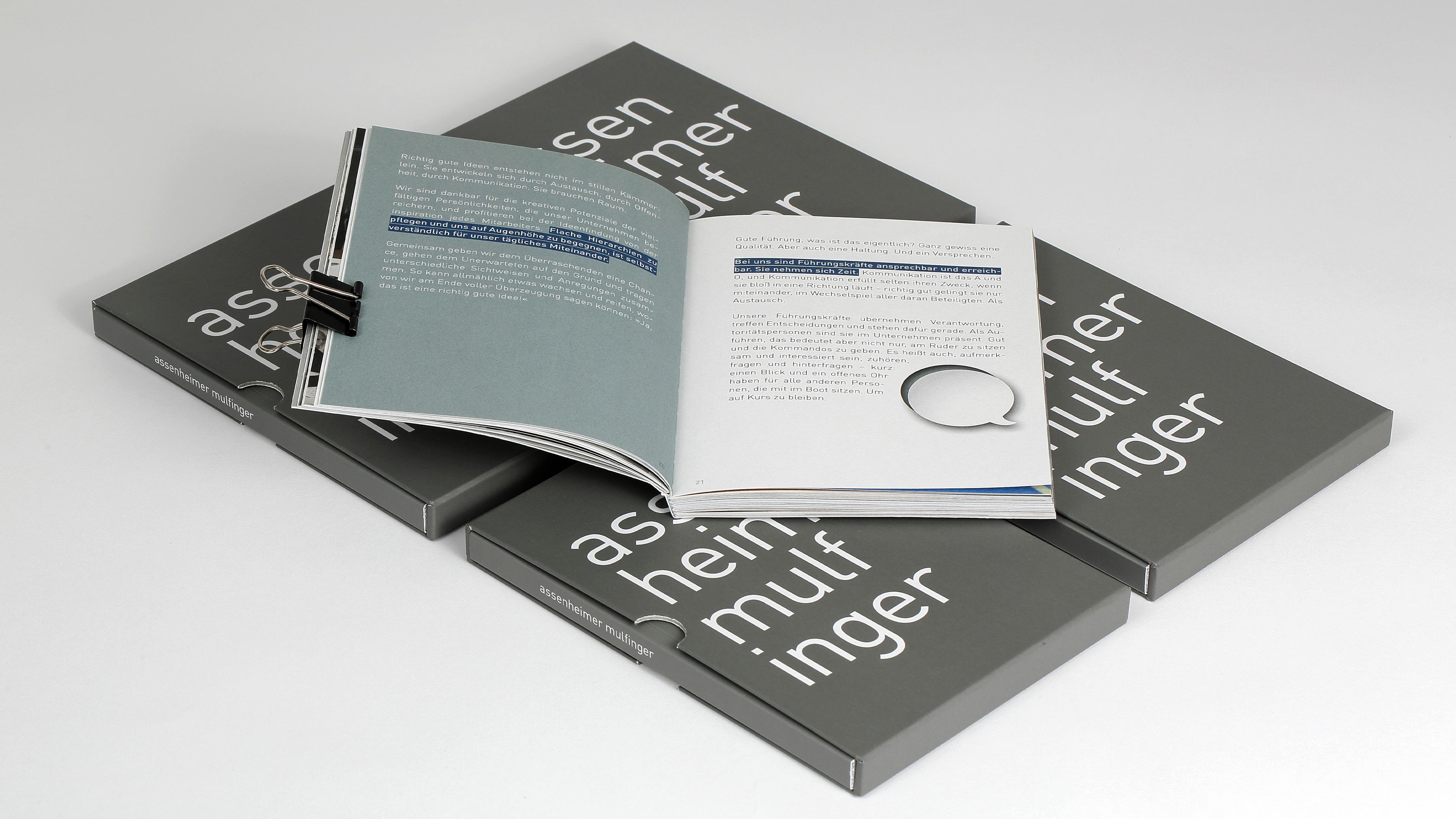 In dieser Publikation verbindet AssenheimerMulfinger Vision und strategische Inhalte mit Neuigkeiten über Mercedes-Benz, smart und natürlich über das eigene Unternehmen. Auf hohem ästhetischem Niveau wird so ein wichtiger Teil der Profilierung des Markenimages von AssenheimerMulfinger abgedeckt sowie eine maßgebliche Wirkung auf die Corporate Identity bei Mitarbeitern, Geschäftspartnern und nicht zuletzt bei Kunden erzielt.