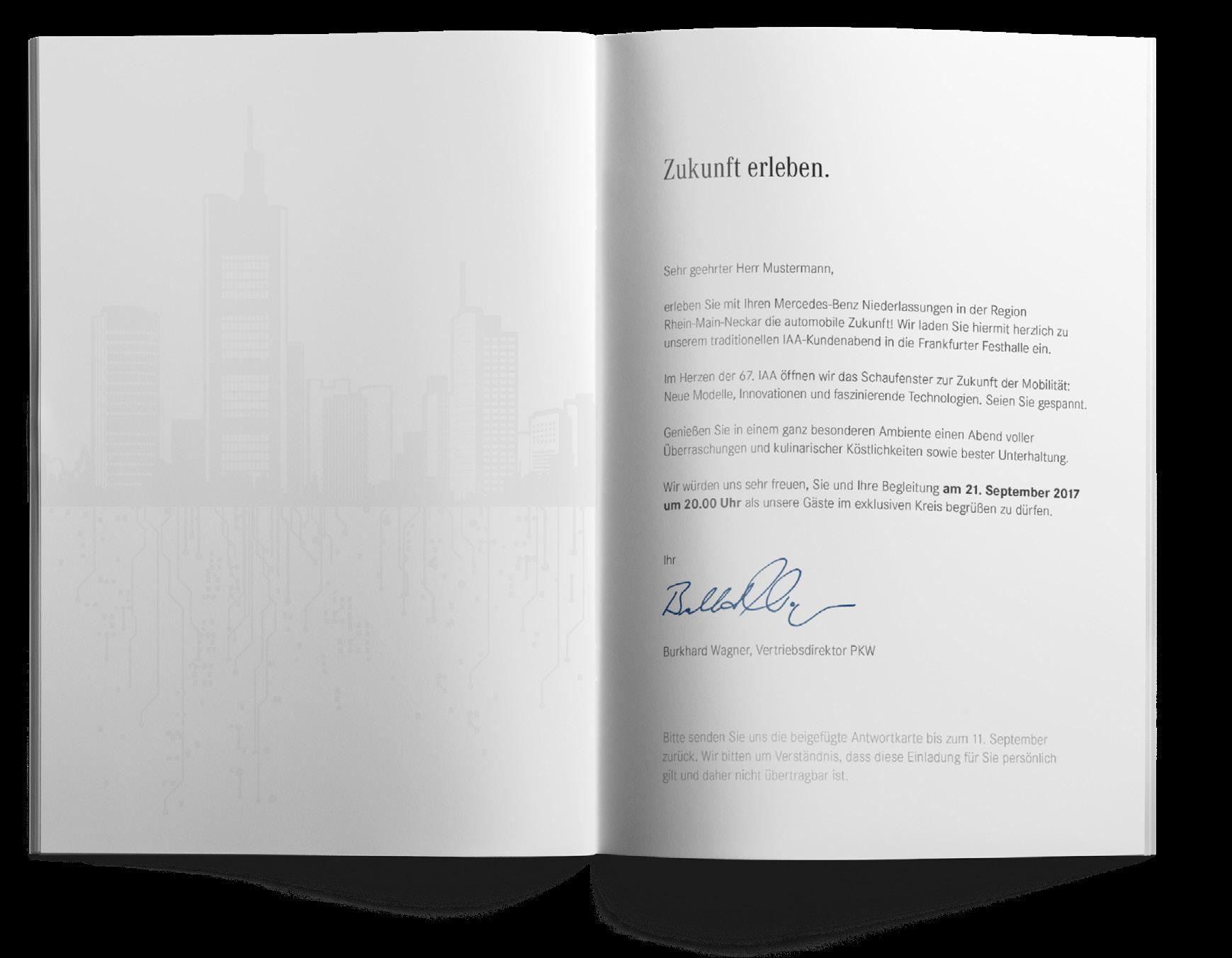 Zum Thema IAA hat Gerryland für die Mercedes-Benz Niederlassung Frankfurt/Offenbach die komplette Einladungs-Produktion übernommen. Von der grafischen und textlichen Konzeption bis hin zur gesamten Abwicklung – inklusive der Organisation von Druck und Lettershop.
