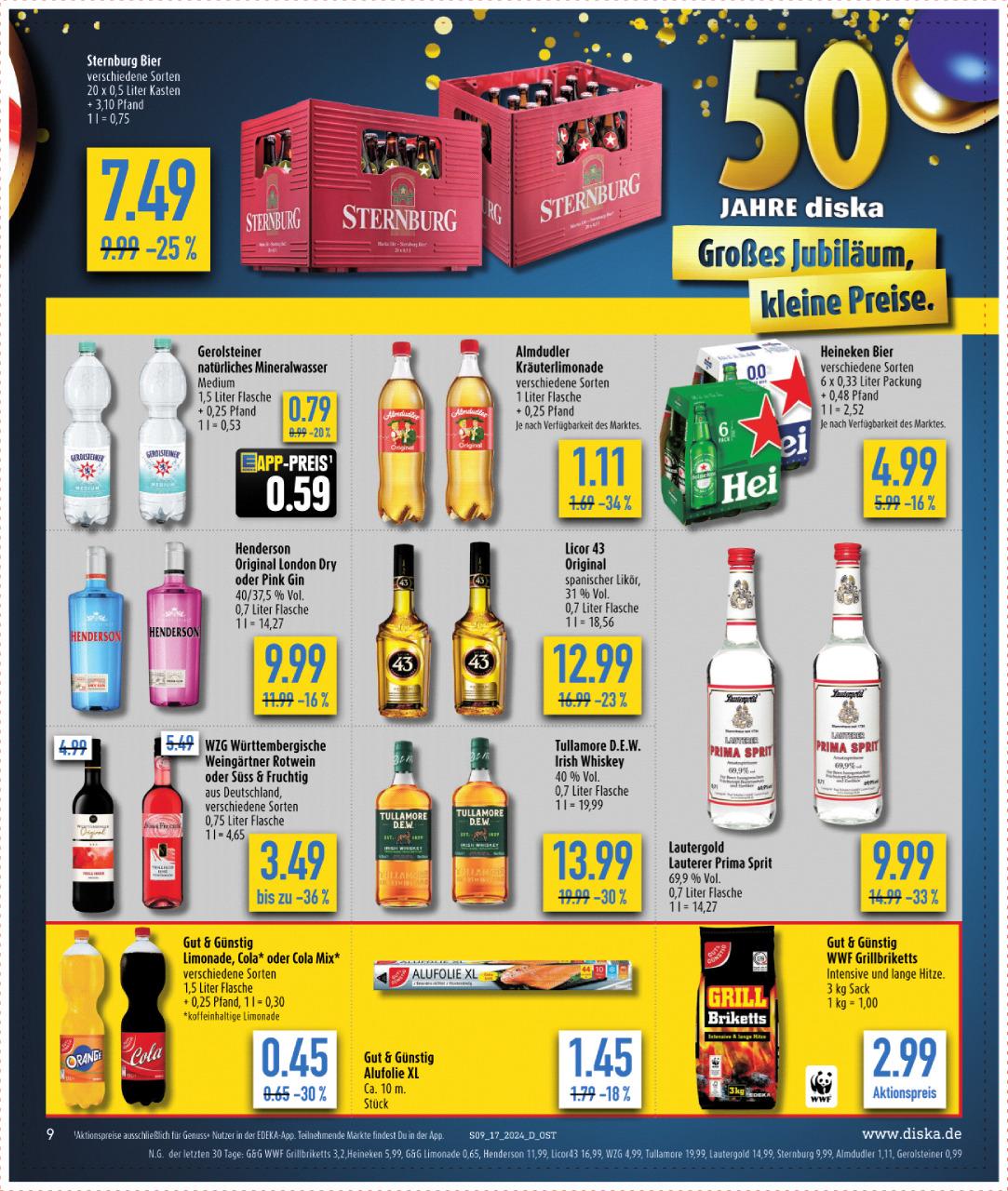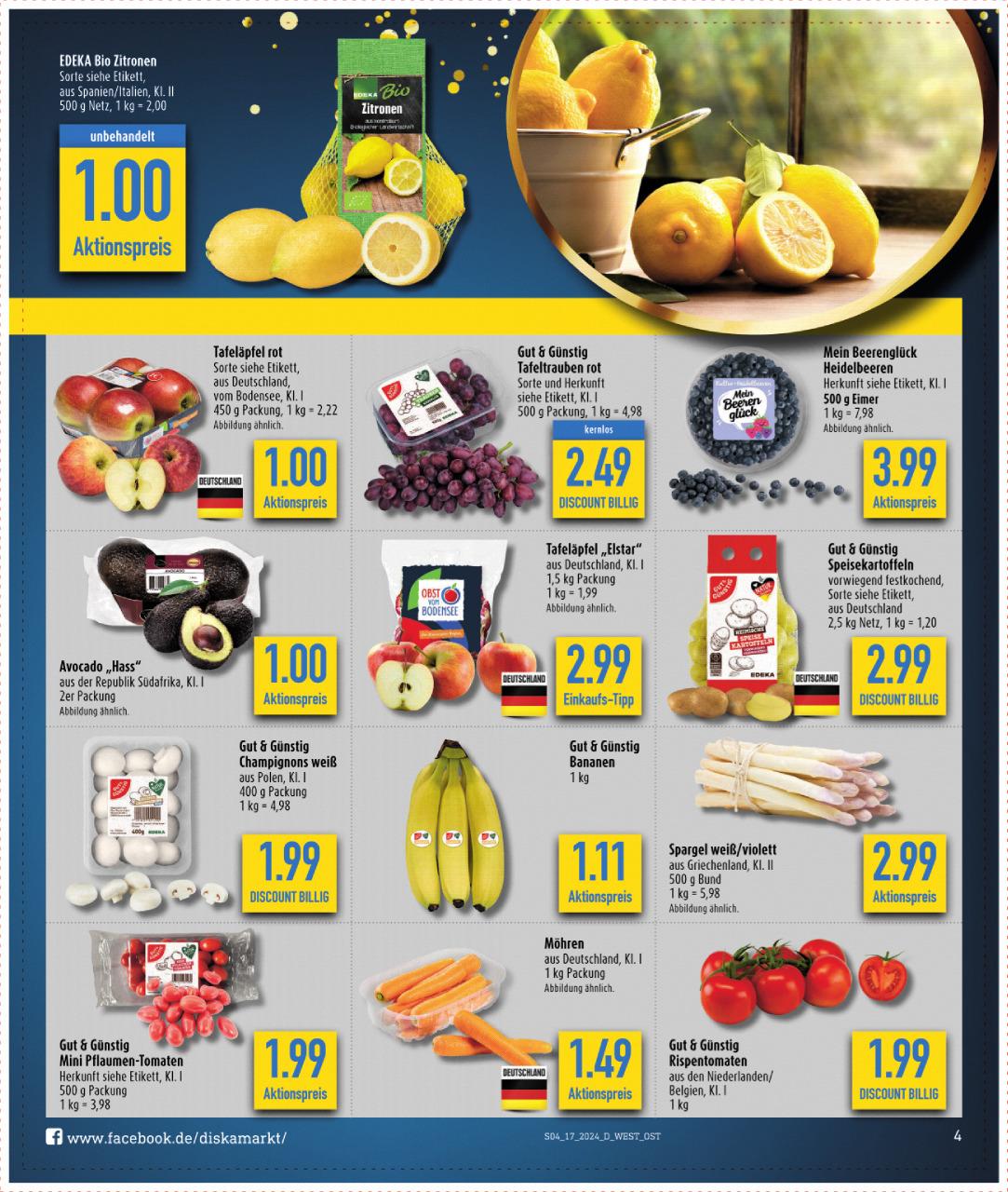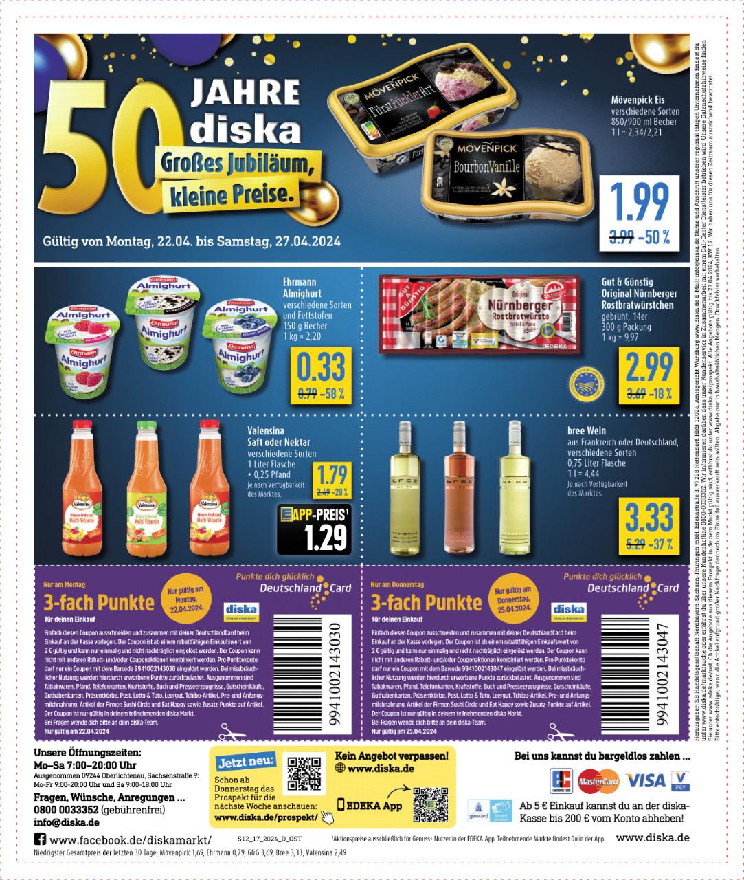 mbH, Edekastraße 3, 97228 Rottendorf, HRB 12026, Amtsgericht Würzburg www.diska.de E-Mail: info@diska.de Name und Anschrift unserer regional tätigen Unternehmen findest du unter www. diska.de/marktsuche oder erfährst du über unsere Kundenhotline 0800-0033352. Wir informieren darüber, dass unser Kundenservice in Zusammenarbeit mit einem Call-Center Dienstleister betrieben wird. Unsere Datenschutzhinweise finden Sie unter www.edeka. de/nst. Ob die Angebote aus diesem Prospekt in deinem Markt gültig sind, erfährst du unter www.diska.de/prospekt. Alle Angebote gültig bis 27.04.2024, KW 17. Wir haben uns für diesen Zeitraum ausreichend bevorratet. Bitte entschuldige, wenn die Artikel aufgrund großer Nachfrage dennoch im Einzelfall ausverkauft sein sollten. Abgabe nur in haushaltsüblichen Mengen. Druckfehler vorbehalten.