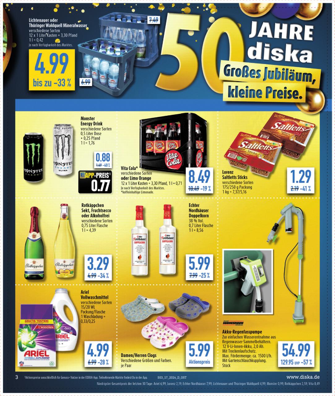 = Mehr sparen 4.44 5.49 -19 % 5.99 8.49 -29 % 1.99 2.49 -20 % 2 Stück 1.00 Aktionspreis Jubiläums-EWU Thüringer Rinderrouladen 2er 700 g Glas 1 kg = 8,56 Nur so lange der Vorrat reicht. Fleischkäse zum Selberbacken 750 g SB-Packung 1 kg = 5,92 LeRo Food Hühnersuppe tiefgefroren 450 g Packung 1 kg = 4,42 Nur solange der Vorrat reicht. 2 Stück Salatgurken aus Spanien/ den Niederlanden, Kl. I entspricht Einzelpreis von 0,50€ 1 Kasten 9.99 14.99 -33 % ab 2 Kästen je 8.99 14.99 -40 % 1 Liter = 0,90 Freiberger Bier verschiedene Sorten 20 x 0,5 Liter Kasten + 3,10 Pfand 1 l = 1,00 www.diska.de www.facebook.de/diskamarkt/ Alle Angebote gültig von Montag, 22.04. bis Samstag, 27.04.2024 KW 17. Wir haben uns für diesen Zeitraum ausreichend bevorratet. Bitte entschuldige, wenn die Artikel aufgrund großer Nachfrage dennoch im Einzelfall ausverkauft sein sollten. Abgabe nur in haushaltsüblichen Mengen. Druckfehler vorbehalten. Niedrigster Gesamtpreis der letzten 30 Tage: Fleischkäse 5,49, EWU 8,49, Freiberger 9,99, LeRo 1,99 U01_17_2024_D_OST alles an deinem ort. Gültig von Montag, 22.04. bis Samstag, 27.04.2024