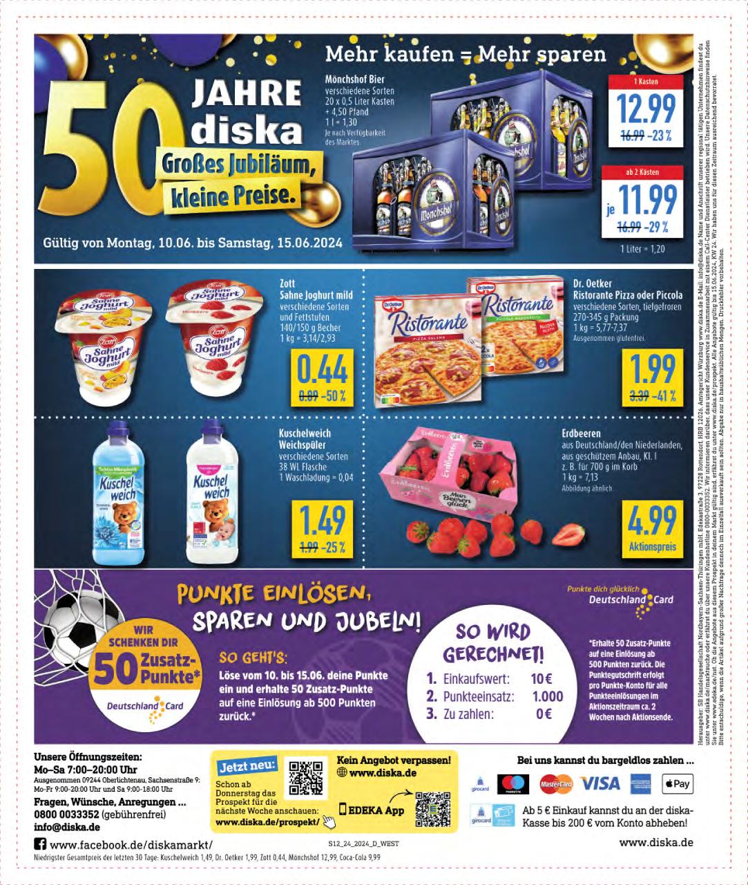 Unsere Datenschutzhinweise finden Sie unter www.edeka. de/nst. Ob die Angebote aus diesem Prospekt in deinem Markt gültig sind, erfährst du unter www.diska.de/prospekt. Alle Angebote gültig bis 15.06.2024, KW 24. Wir haben uns für diesen Zeitraum ausreichend bevorratet. Bitte entschuldige, wenn die Artikel aufgrund großer Nachfrage dennoch im Einzelfall ausverkauft sein sollten. Abgabe nur in haushaltsüblichen Mengen. Druckfehler vorbehalten.