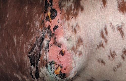 Botryomycosis is an inflammatory reaction following bacterial infection of the skin (cutaneous form) and/or the underlying tissues or intestines (visceral form) (see Photo 1). Chronic, granulomatous and purulent masses appear, which consist of an accumulation of inflammatory tissue and cells and which may contain various bacterial species. In cattle, botryomycosis can be caused by Pseudomonas aeruginosa, but other bacteria such as Staphylococcus aureus and Trueperella pyogenes can also cause this type of inflammation. The consequences for the affected animals are significant: antibacterial therapy has little effect and there is a risk of infertility and abortion. In terms of prevention, it is important to take strict hygiene precautions during a surgical procedure (such as a caesarean section), and to take account of the risk of P. aeruginosa being resistant to chlorhexidine.