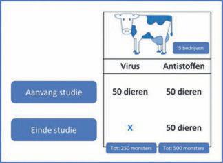 steld. Daarnaast werden klinische symptomen vastgelegd van maximaal twintig dieren aan de hand van vooraf opgestelde protocollen. Tot slot werden bloedmonsters genomen van vijftig willekeurige dieren voor onderzoek op de aanwezigheid van virus en antistoffen (zie gifuur 1).