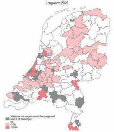 Het percentage bedrijven met veel antistoffen tegen longworm in de tankmelk was laag. De afgelopen jaren schommelde het percentage rond de 3-4 procent. Dit jaar was het iets lager dan vorig jaar, namelijk 2 procent. Zie guur 1 voor de verdeling van de uitslagen over Nederland.