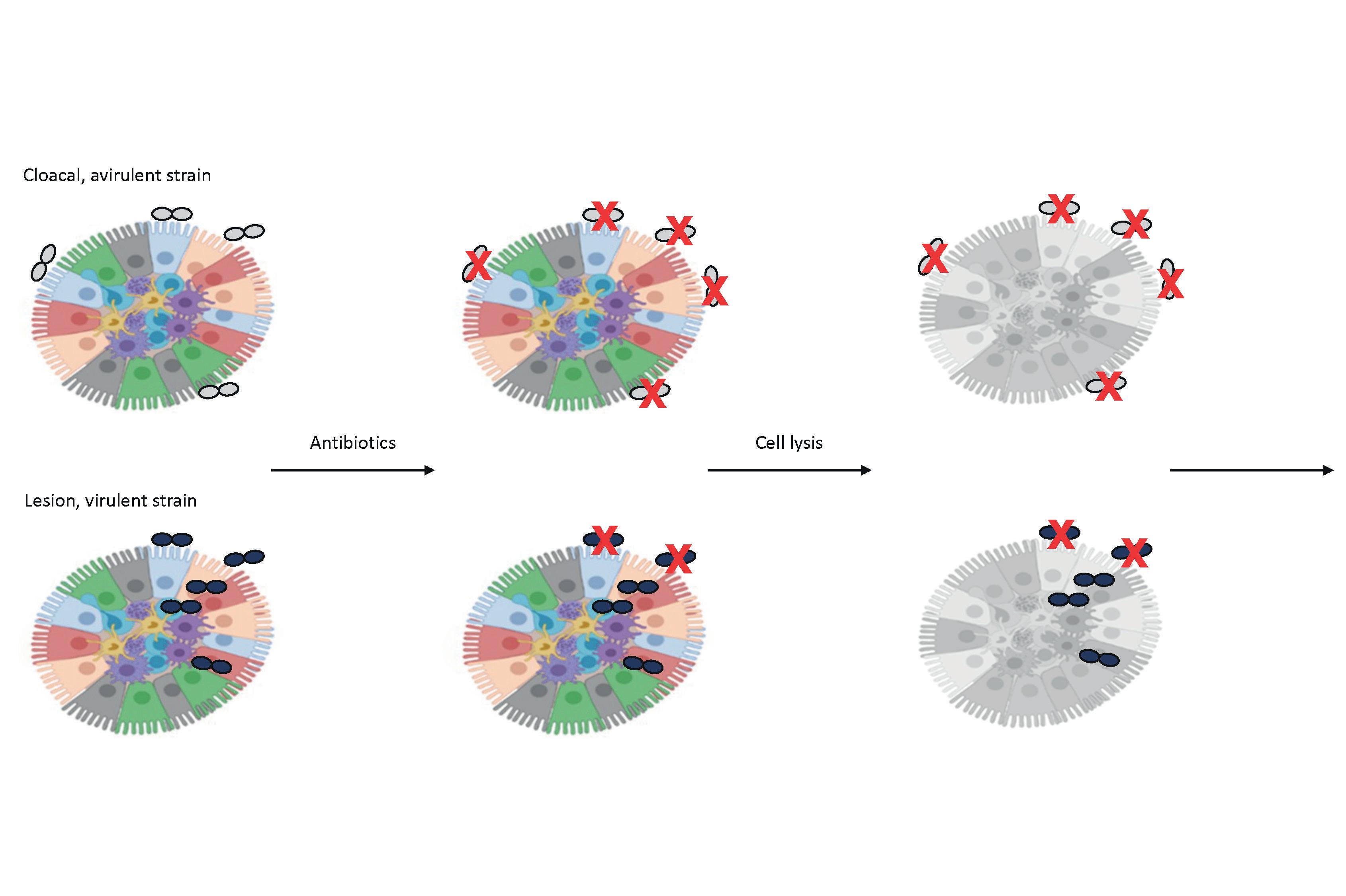 • Cloacal (avirulent) and lesion (virulent) strains of E. cecorum can be distinguished based on invasion in chicken intestinal organoids.