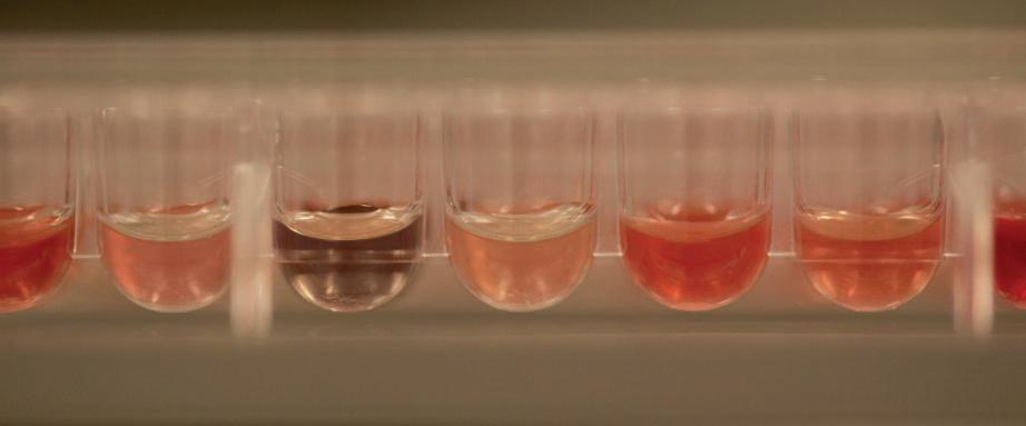 Een testplaat, met daarin het bezinksel dat te zien is na het uitvoeren van de HAR-test. Wanneer er geen of onvoldoende afweerstoffen in de verdunning zaten, zijn de rode bloedcellen aan elkaar geklonterd.