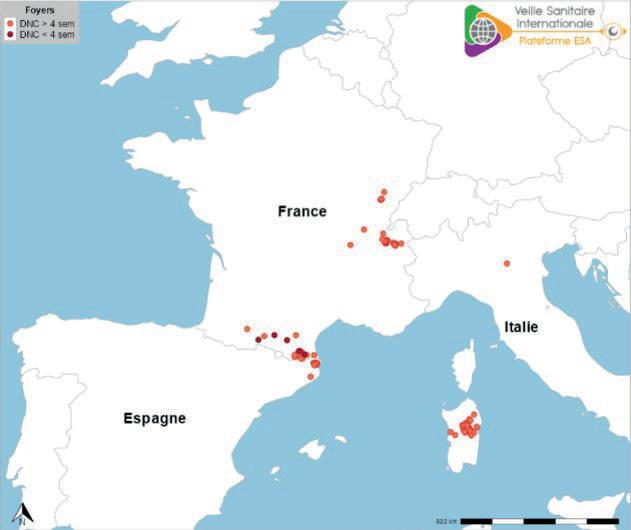 Figuur 1. Links: LSD-besmettingen in Spanje en Frankrijk, met de verschillende ingestelde zones tot en met 30-12-2025. Rechts: LSD-besmettingen in Europa van tot en met 04-01-2025, met in oranje de besmettingen ouder dan 4 weken, en donkerrood de besmettingen in de meest recente 4 weken (bronnen: Ministerio De Agricultura, Peca y Alimentación, geconsulteerd op 07-01-2026, BHVSI-SA du 06/01/2026)