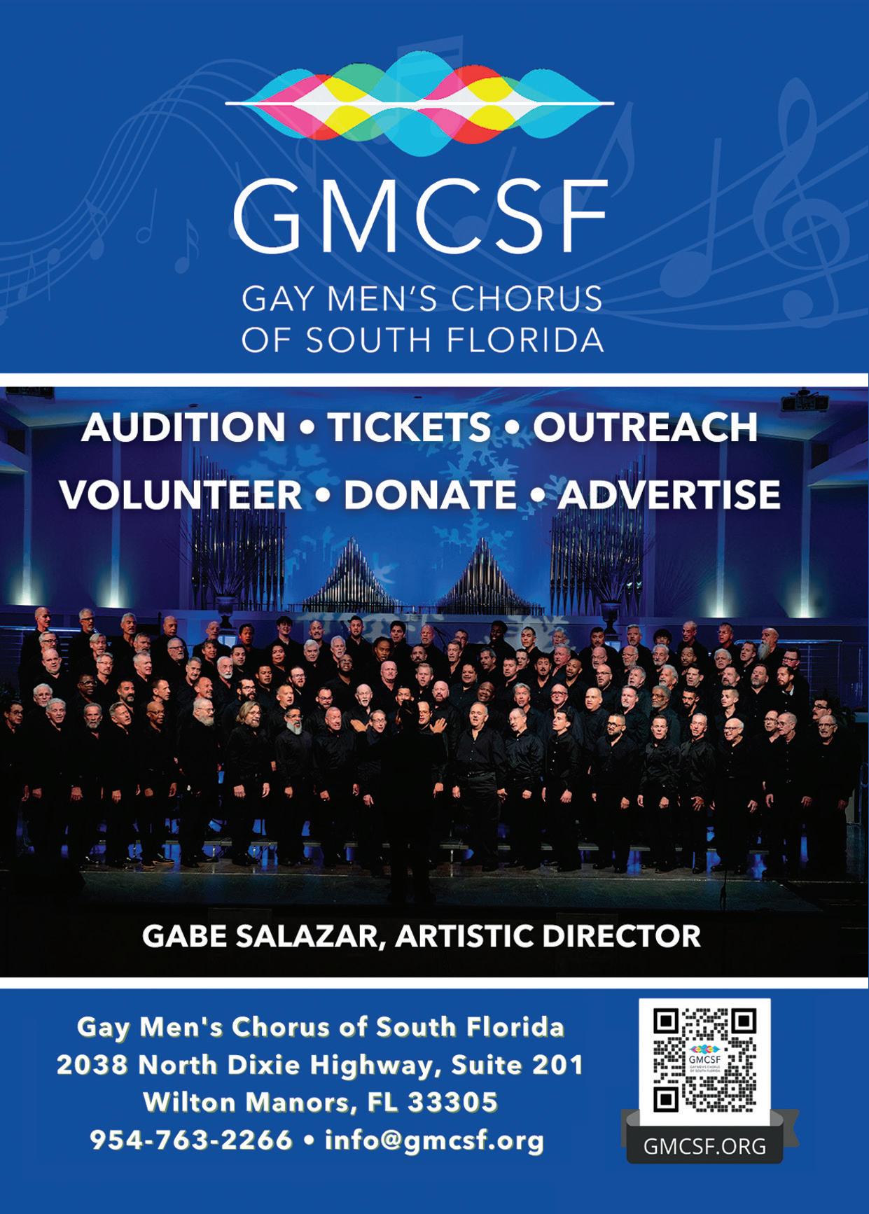 and volunteer projects. More than 20,000 people are inspired and moved each year by the Chorus’s music, community outreach, and mission, making GMCSF a significant LGBTQ+ nonprofit service organization and cultural asset in the heart of South Florida. With more than 150 singing members, the Gay Men’s Chorus of South Florida is the southeastern United States’ largest gay men’s chorus and one of the country’s ten largest nonprofit LGBTQ+ choruses. See their ad in this guide.