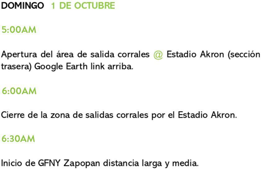 8:00am - Inicio de GFNY Kids Zapopan @ Parte trasera del Estadio Akron, (todos los grupos de edad deben estar en el área de inicio 30 minutos antes).