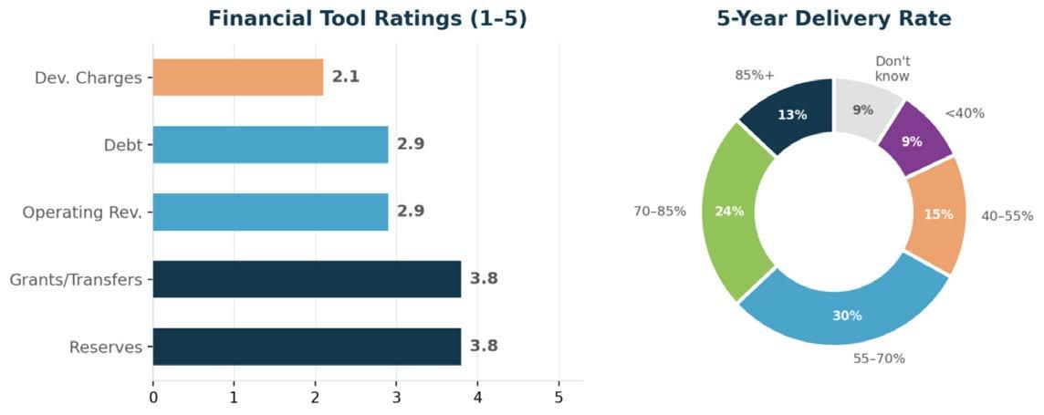 “RESERVES AND GRANTS BOTH RATE 3.8 OUT OF 5 AS FUNDING TOOLS. DEVELOPMENT CHARGES SCORE JUST 2.1 — POTENTIALLY REFLECTING THE REALITY OF SMALLER LOCAL GOVERNMENTS.”