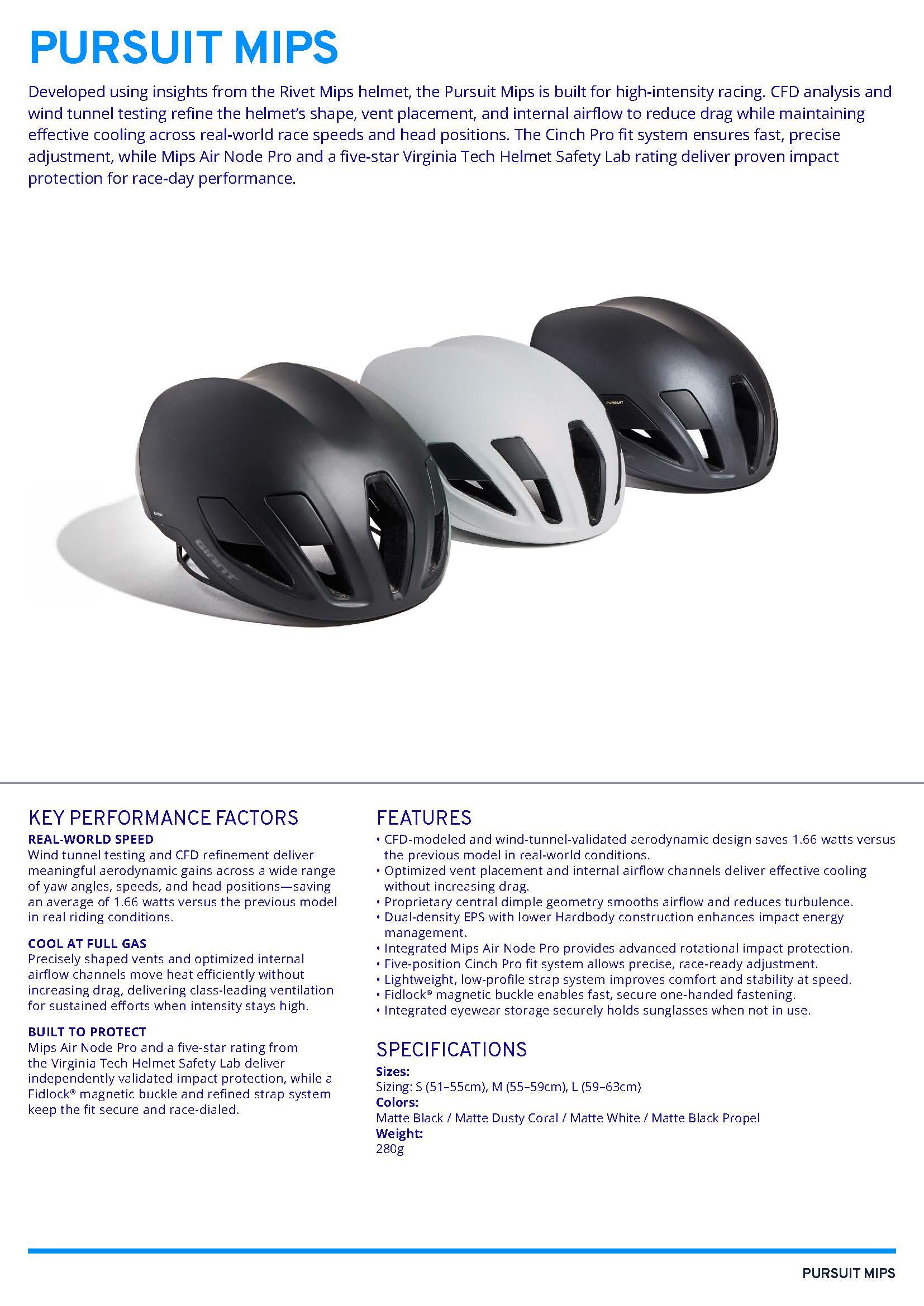 Developed using insights from the design of the Rivet Mips helmet, Pursuit Mips applies proven engineering to high-intensity racing. Extensive Computational Fluid Dynamics (CFD) and wind tunnel testing guided engineers in refining the helmet’s shape, surface transitions, vent placement, and internal airflow channels to reduce drag while maintaining effective cooling across real-world race speeds, yaw angles, and head positions. The Cinch Pro retention system delivers fast, precise fit adjustment, while Mips Air Node Pro and a five-star Virginia Tech Helmet Safety Lab rating provide independently validated impact protection. The result is a data-driven, low-drag race helmet built to perform when the pace is on.