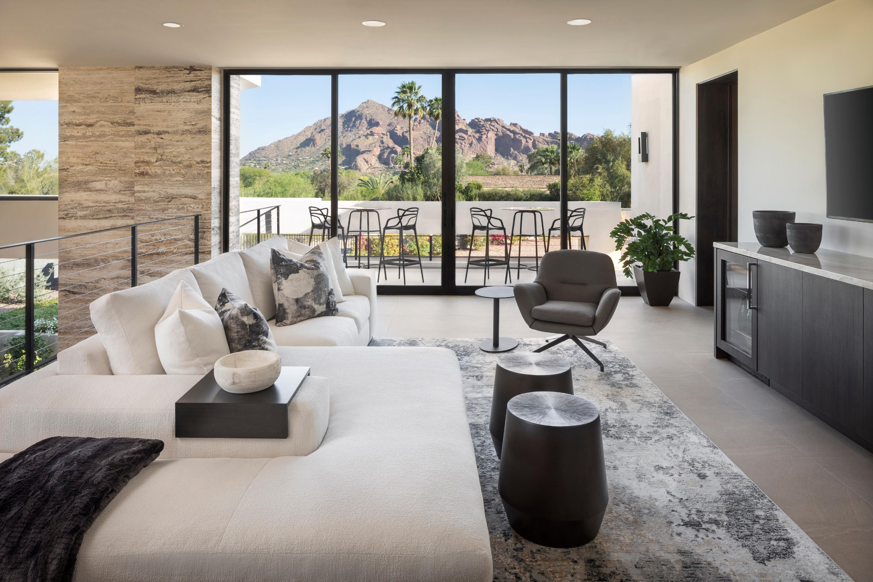 Embodying a clean, modern sophistication, the award-winning Razor?s Edge property is an architectural triumph harmoniously blending form and function with the natural desert environment Designed by C P Drewett and built by Bedbrock Developers, this modern home ?literally floats above the desert floor, creating unique shadow lines and compelling architecture." Tuscan stone and black basalt wrap the home inside and out. Travertine massing joins impressive roof overhangs from beveled edges that ?blur the distinction between roof and walls.?Moving glass walls in the main living area gives rise to unobstructed views of Camelback Mountain and unify indoor and outdoor spaces. Clerestory and oversized windows were placed to perfectly frame the stunning desert topography, such as Mummy Mountain and Phoenix Mountain Preserve, and provide a 360-degree perspective with ?view corridors from every room.?Interior finishes elevate its artistic exterior with details like the quartzite Taj Mahal stone and a St Gabriel leathered black granite bar. The Snaidero Italian kitchen features a wine cellar and Wolf Sub-Zero appliances. Custom lighting is found throughout and Italian porcelain tile embellishes the floors and extends to outdoor spaces. The Crestron Electronics system powers the home and professional landscaping adorns the property?s perimeter Winner of the 2021 Gold Nugget Award of Merit among many others, the home attained international recognition for best custom home 4000-6000 sq ft. Razor?s Edge is a state-of-the-art contemporary masterpiece.