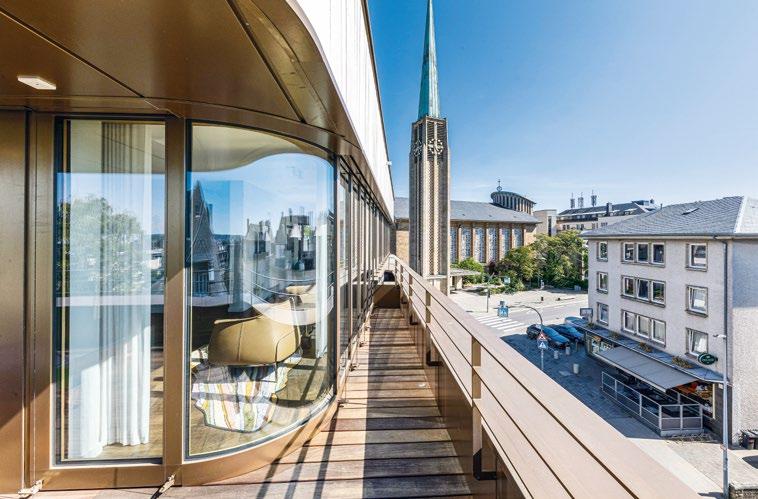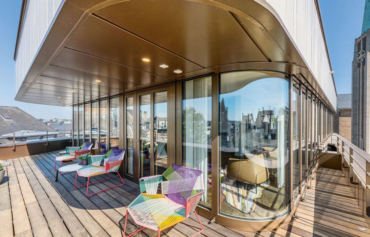 En el ático aguarda la zona de bienestar Seijaku, un refugio inspirado en la filosofía japonesa. Paneles de papel realizados a mano e inspirados en la arquitectura tradicional de los onsen, tatamis y tonos cálidos de madera crean espacios de calma. A través de una estrecha escalera, los huéspedes acceden a la azotea, donde podrán disfrutar de unas vistas privilegiadas del Rin y la ciudad de Basilea.