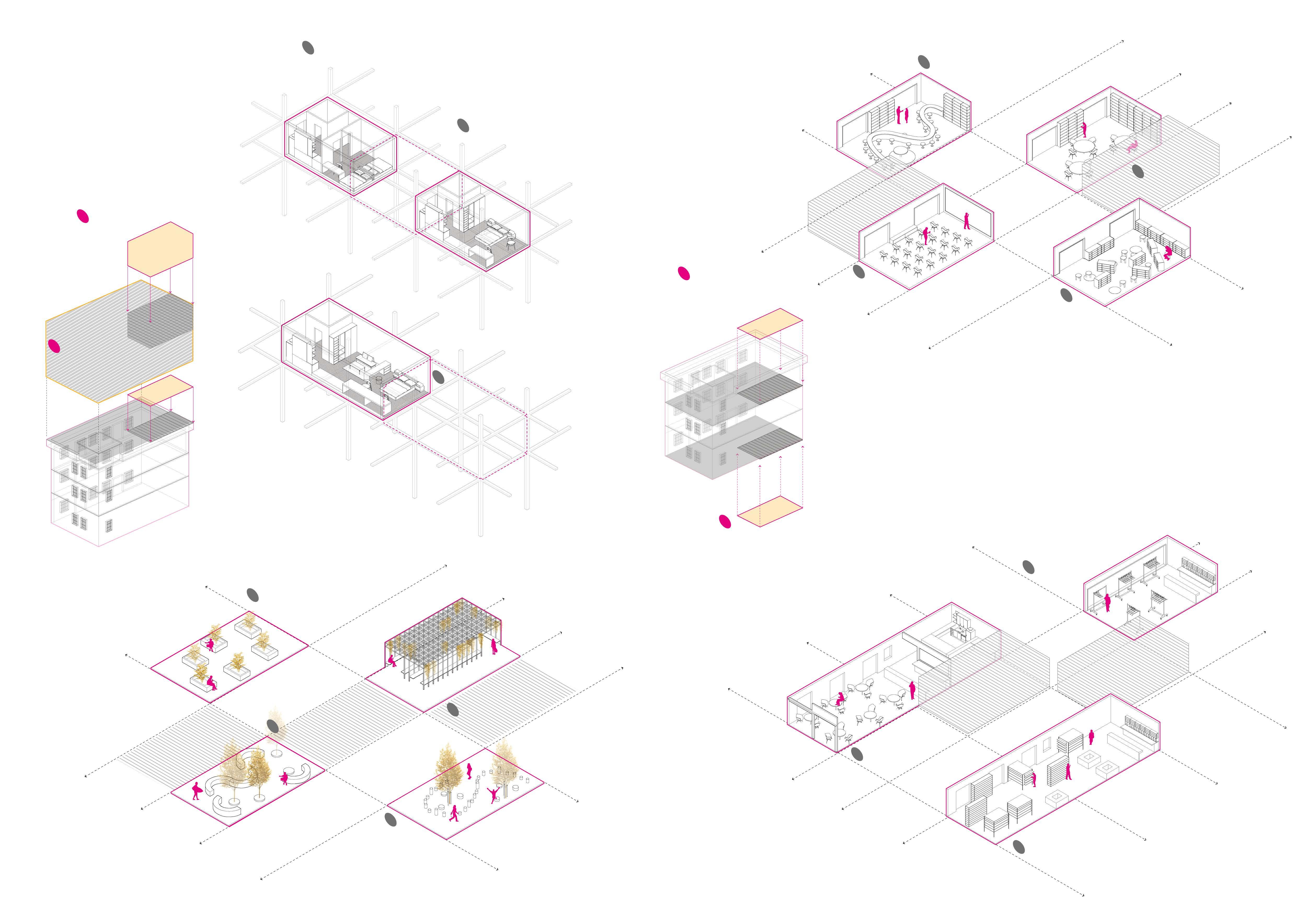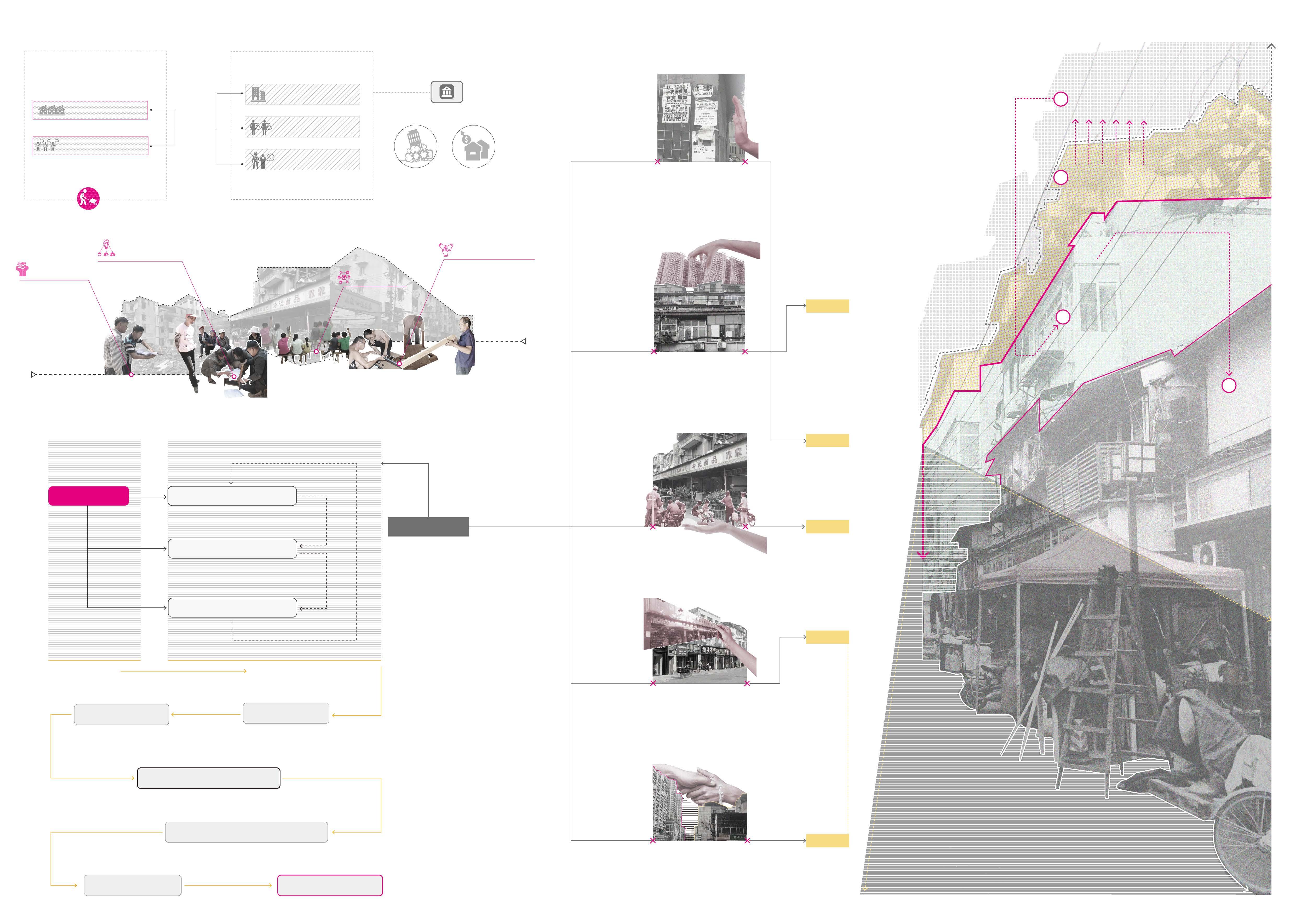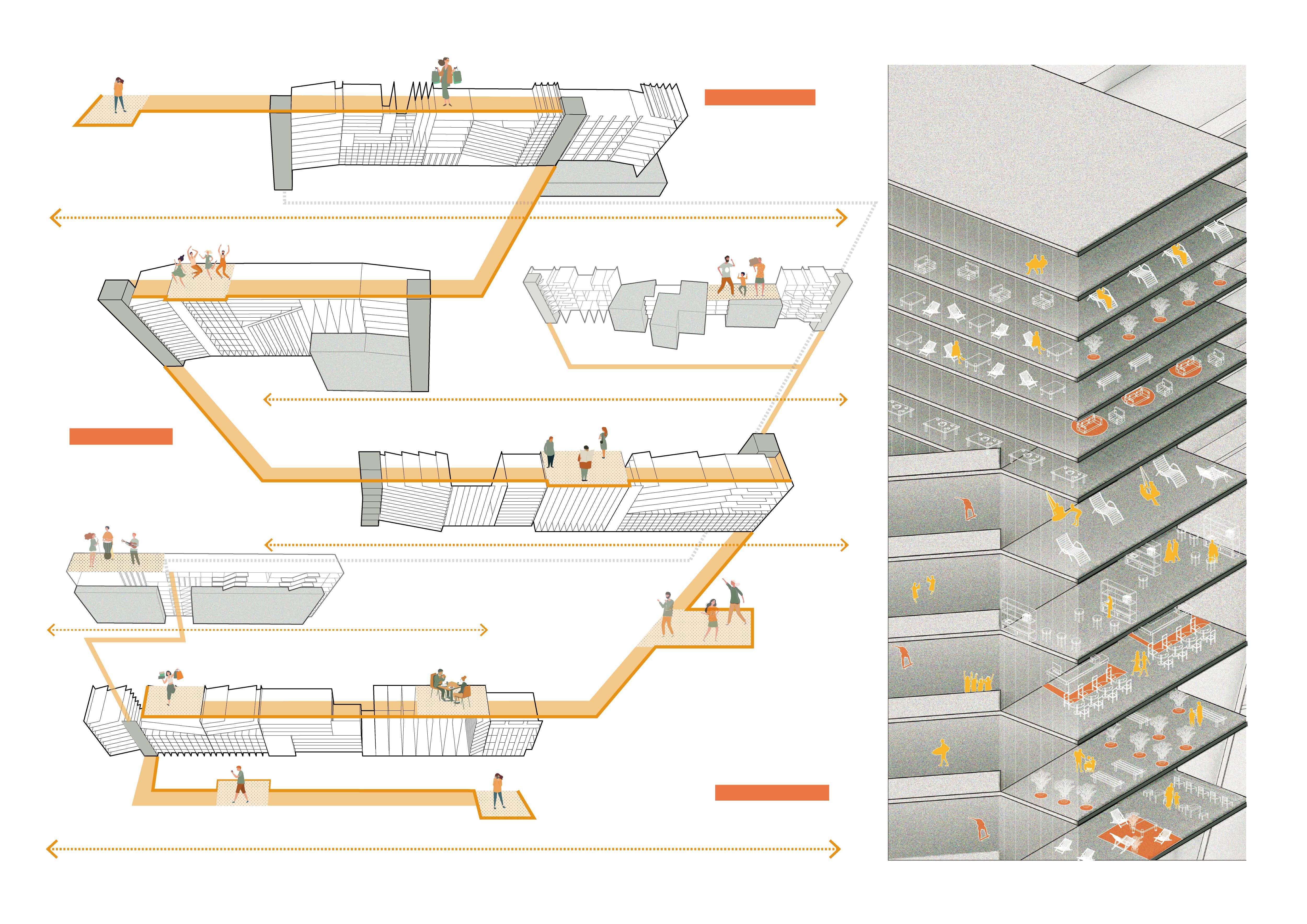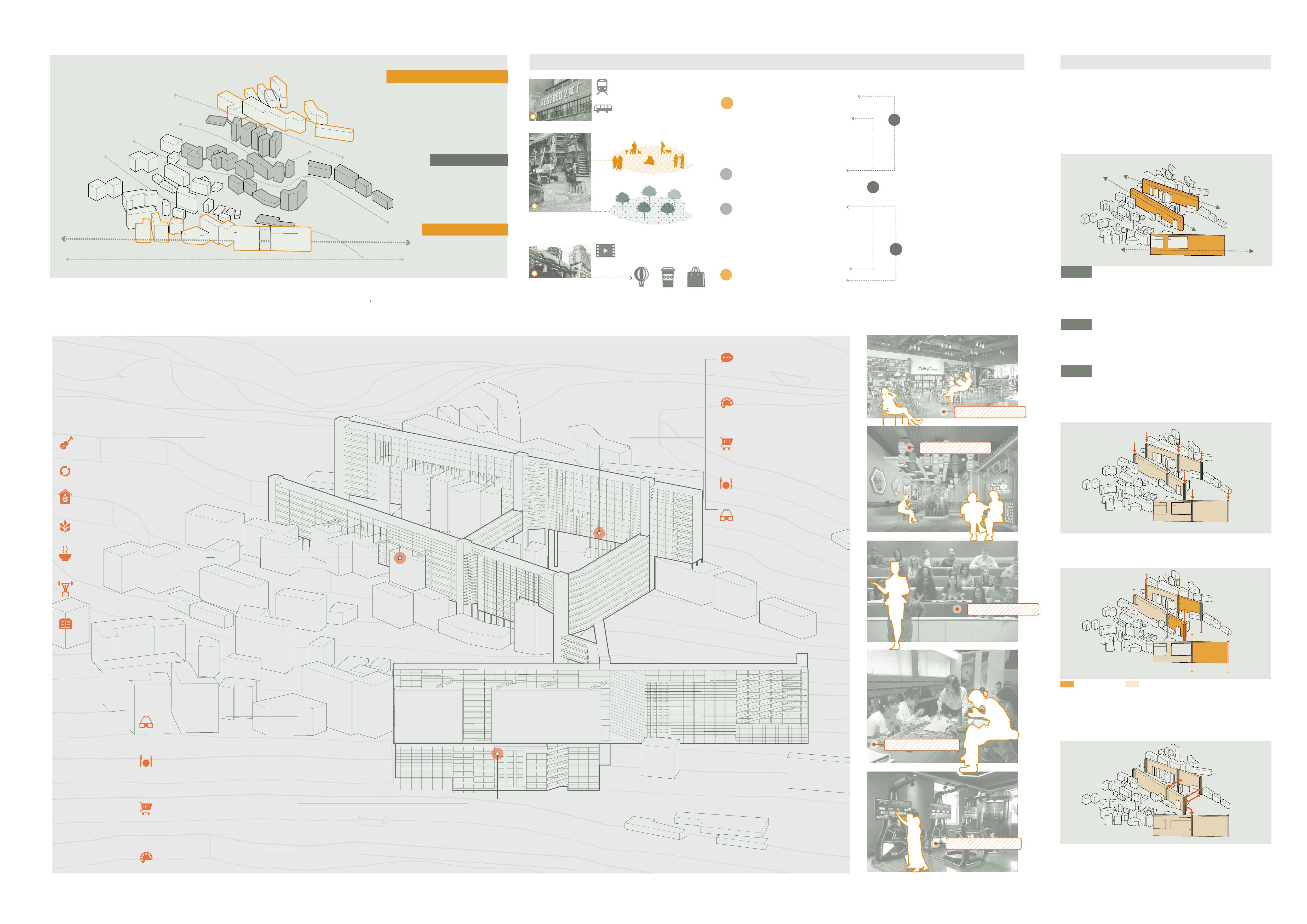 3.Boxes connection & Urban Invation Connect 4 boxes with 2 layer of paths. The architecture has no facade or walls, so everyone can casually walk into the building through 5 entrance from both sides.