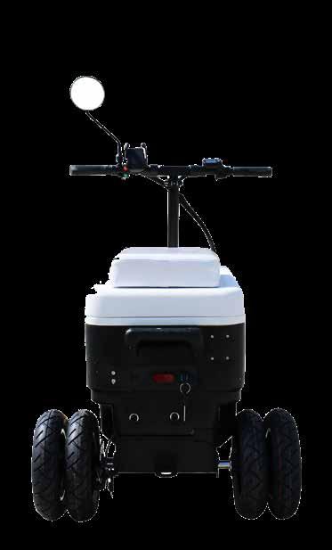 Motorized cooler scooter with mobile phone holder and USB charging port.