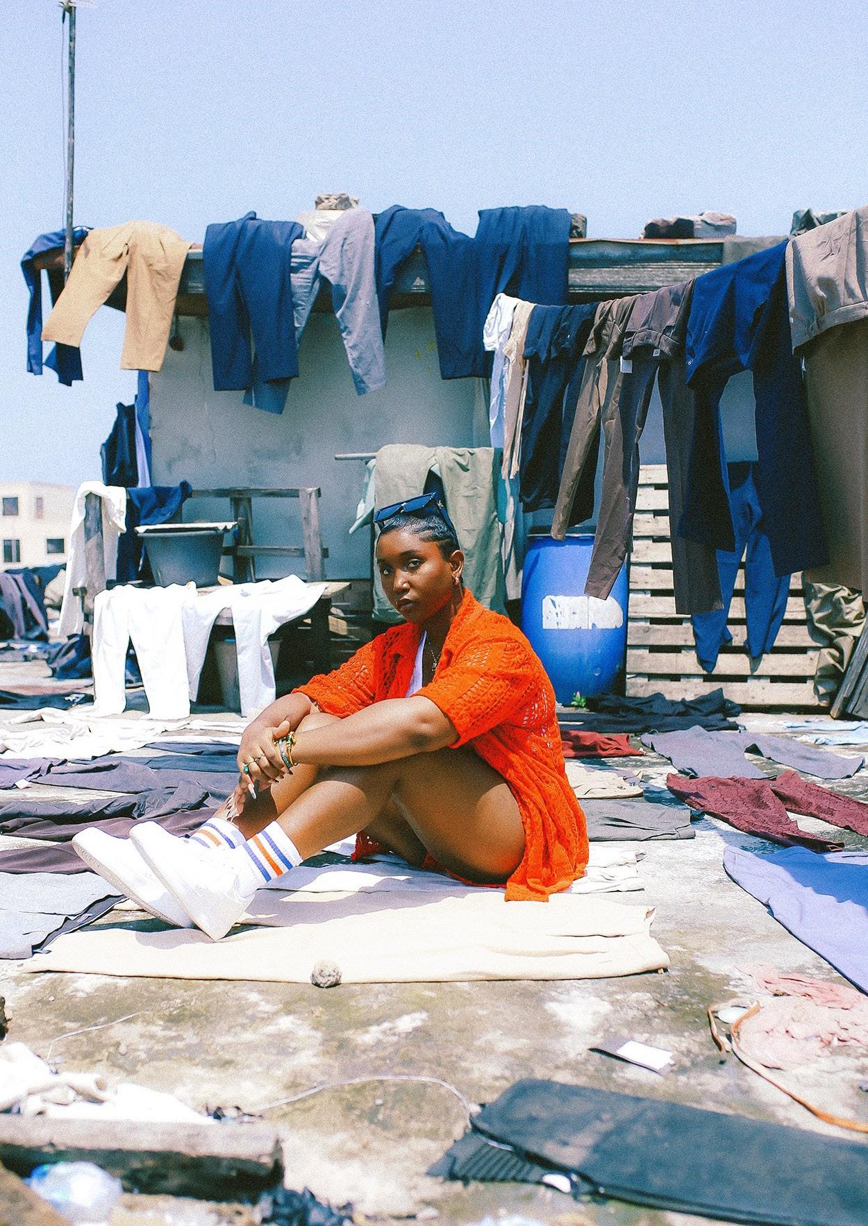 stjernen Burna Boy på låret af en hel stak shorts. En kvinde tryller på fem minutter en gammel T-shirt til voksne om til en barnekjole med flæseskørt. Og Kweku, en ung økonomistuderende, afbleger sorte jeans med klorin i et mønster, der er blevet så populært, at det er hans trademark.