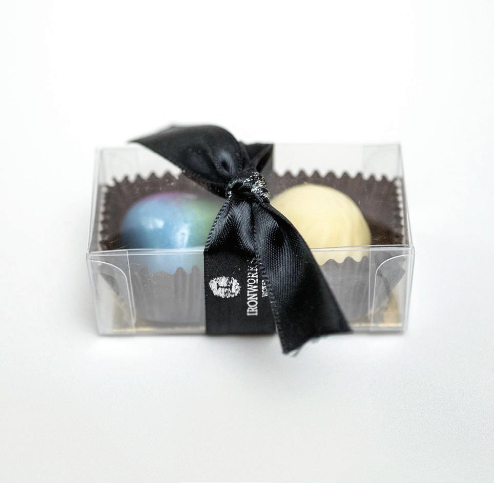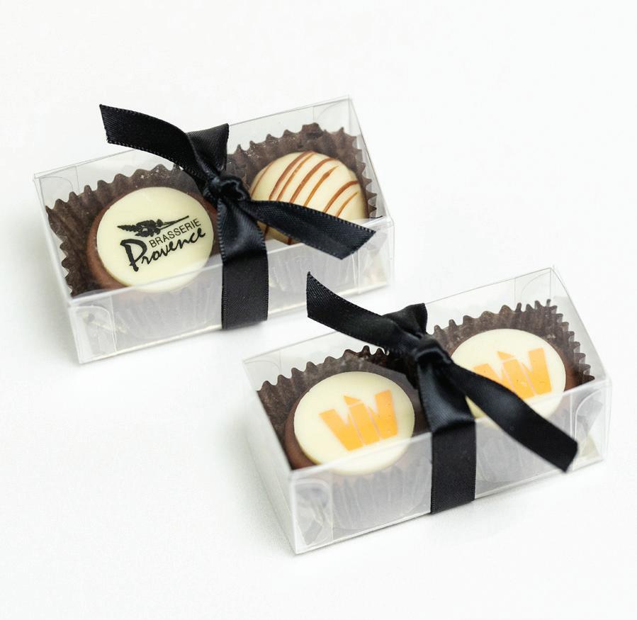 A two-piece chocolate assortment presented in a clear gift box enclosed with your custom logo satin ribbon. The perfect size for gifting as an elegant favor.