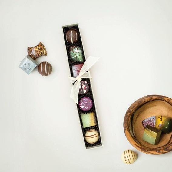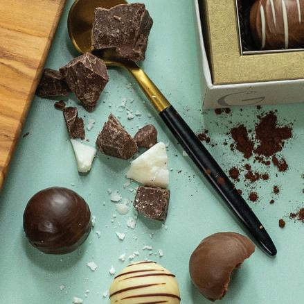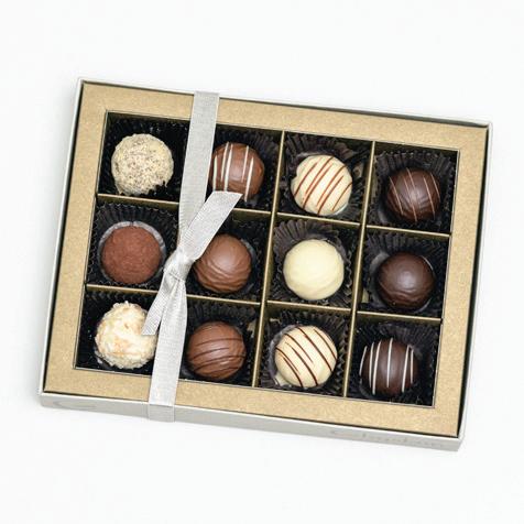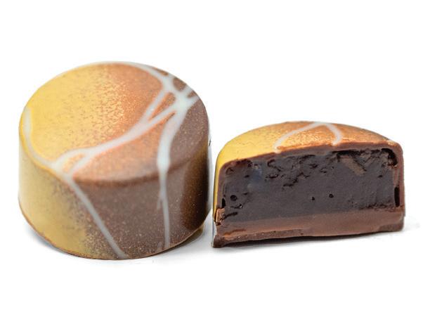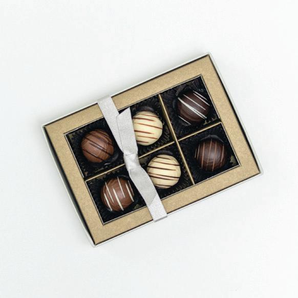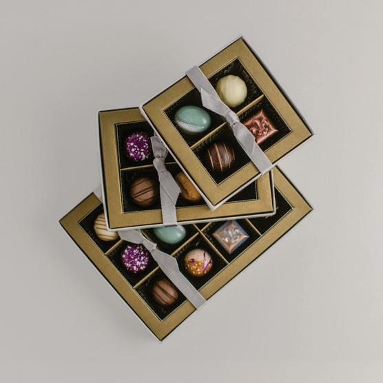 Hand-poured, ornately decorated truffles blended with infused fresh cream and the essence of exotic extracts. Each truffle is delicately dipped into one of the three chocolate couvertures.