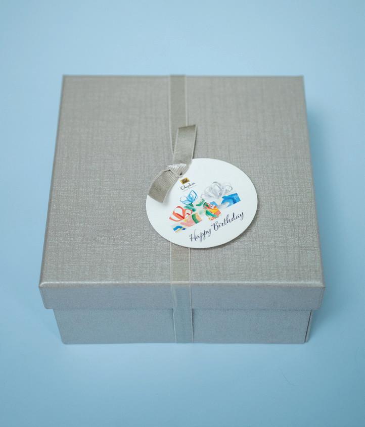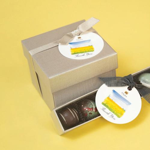 Present your chocolate assortment in one of our sophisticated multi-tiered silver metallic linen boxes enclosed with your custom logo satin ribbon. 8, 16, 18 and 36-Count Gift Boxes