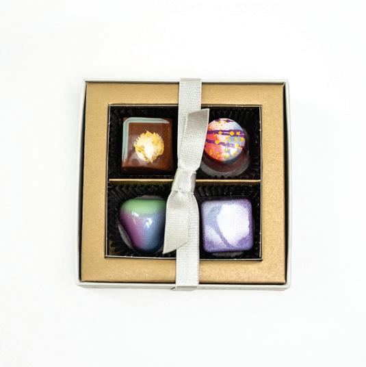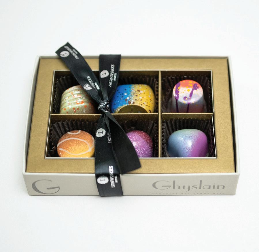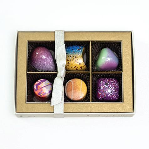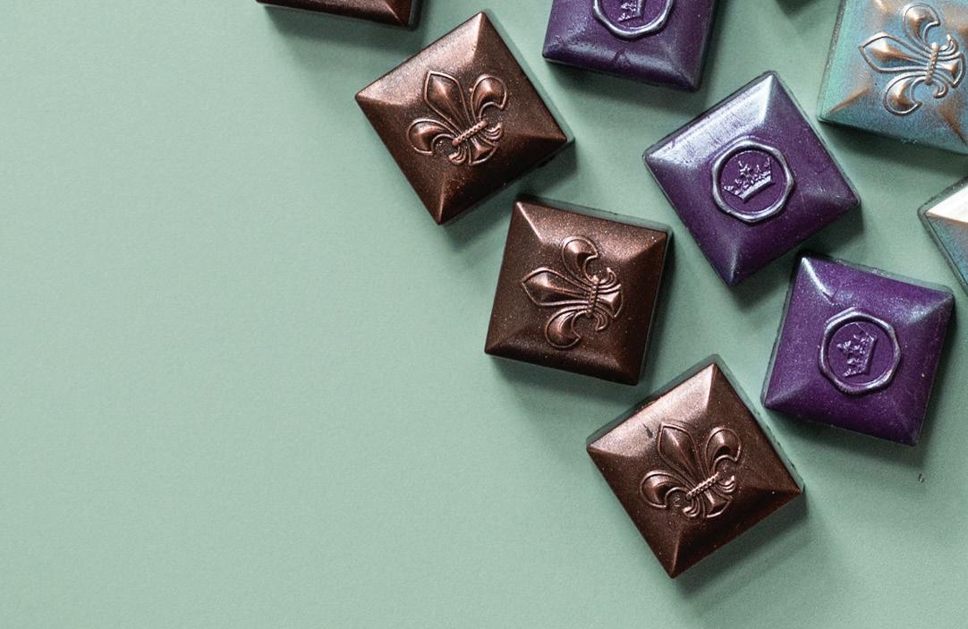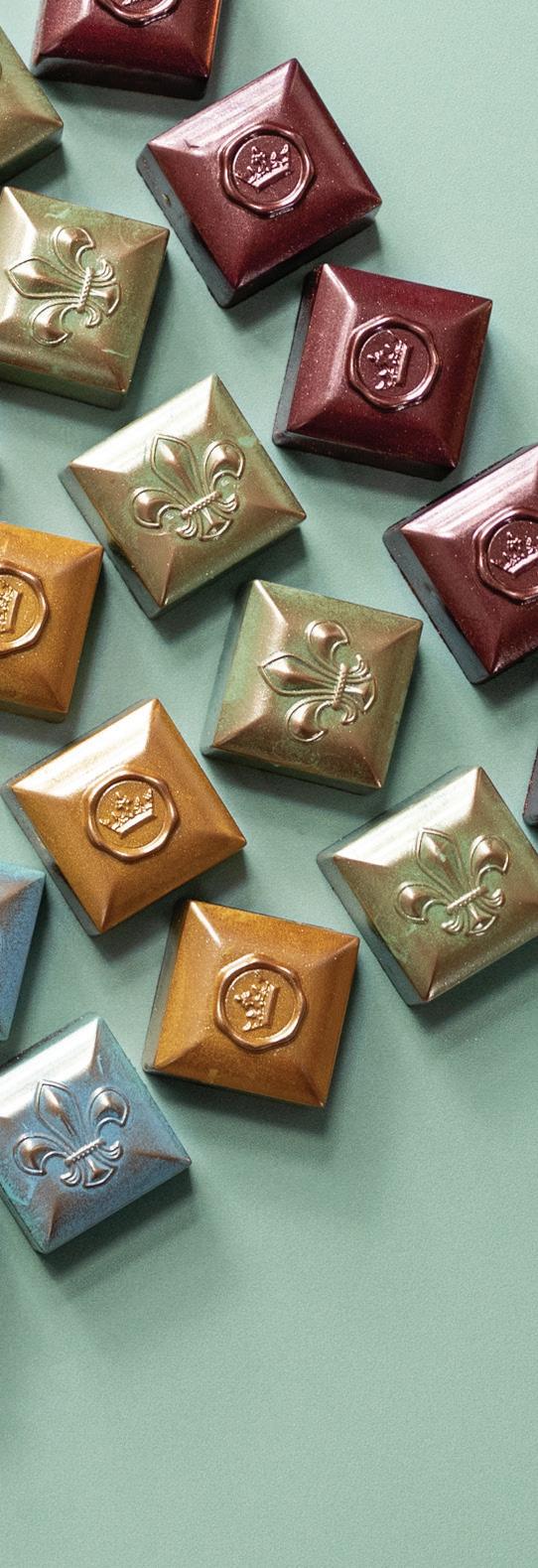 Featuring milk and dark chocolate shells filled with Ghyslain’s signature infused butter caramel. Each of six flavors are adorned with a crown or Fleur de Lis, beautifully hand-painted a brilliant metallic hue.