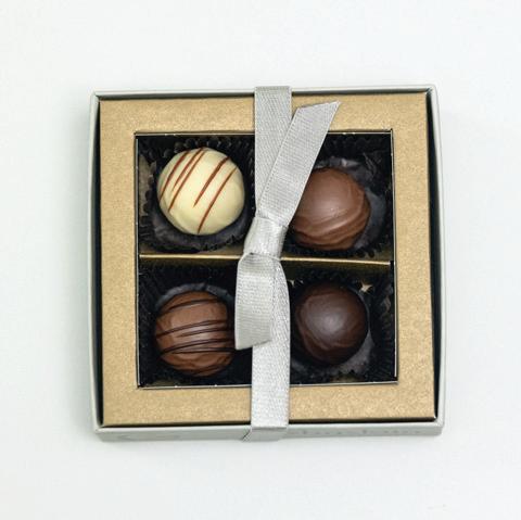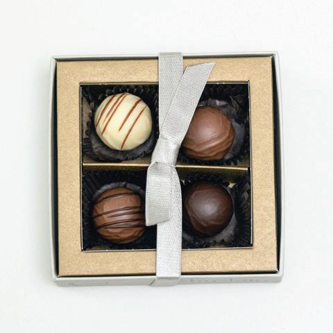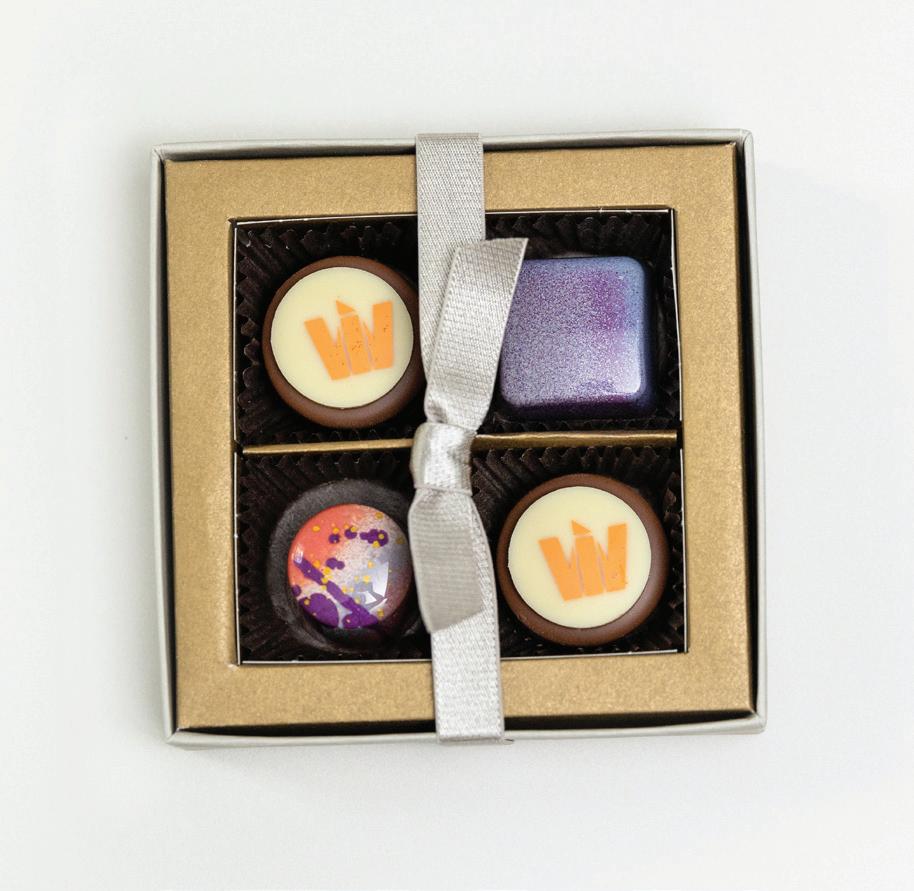 Present your bespoke chocolate assortment in our hallmark branded window box featuring a metallic gold frame enclosed with a clear lid and tied satin ribbon. 4-Count Gift Box