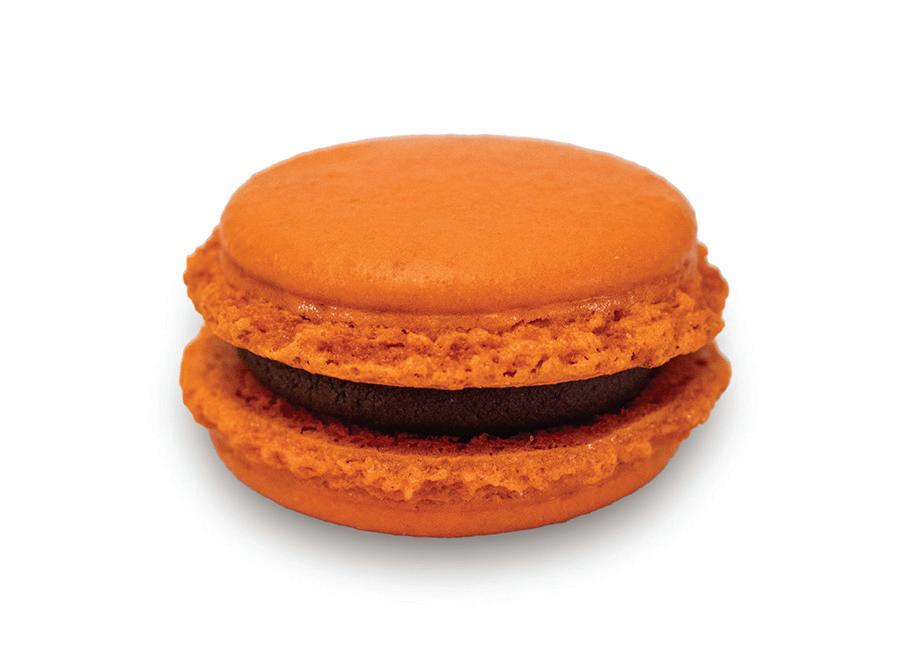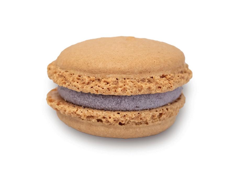 Caramel macaron with milk chocolate ganache and a caramel center.